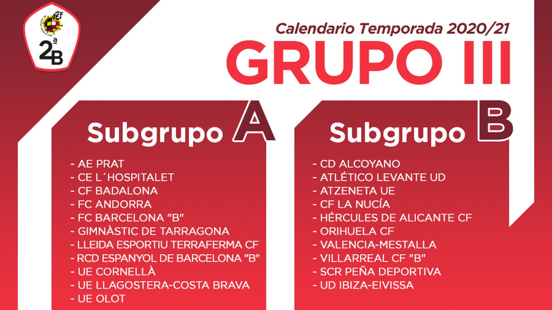 La Federación española ha hecho oficial el calendario de Segunda B. El nuevo formato de la competición divide cada uno de los cinco grupos de Segunda División B en dos subgrupos. En el caso del grupo III el subgrupo A contará con 11 equipos por 10 en el subgrupo B, que es en el que están los equipos valencianos. En él están incluidos el Valencia CF Mestalla, el Atlético Levante UD, el Villarreal CF B, el Alcoyano, Atzeneta, La Nucía, Hércules y Orihuela El subgrupo A contará pues con 22 jornadas, que arrancarán el 18 de octubre de 2020 y finalizarán el 28 de marzo de 2021. El subgrupo B tendrá 18 jornadas que empezarán el 18 de octubre de este año y terminarán el 21 de marzo de 2021.