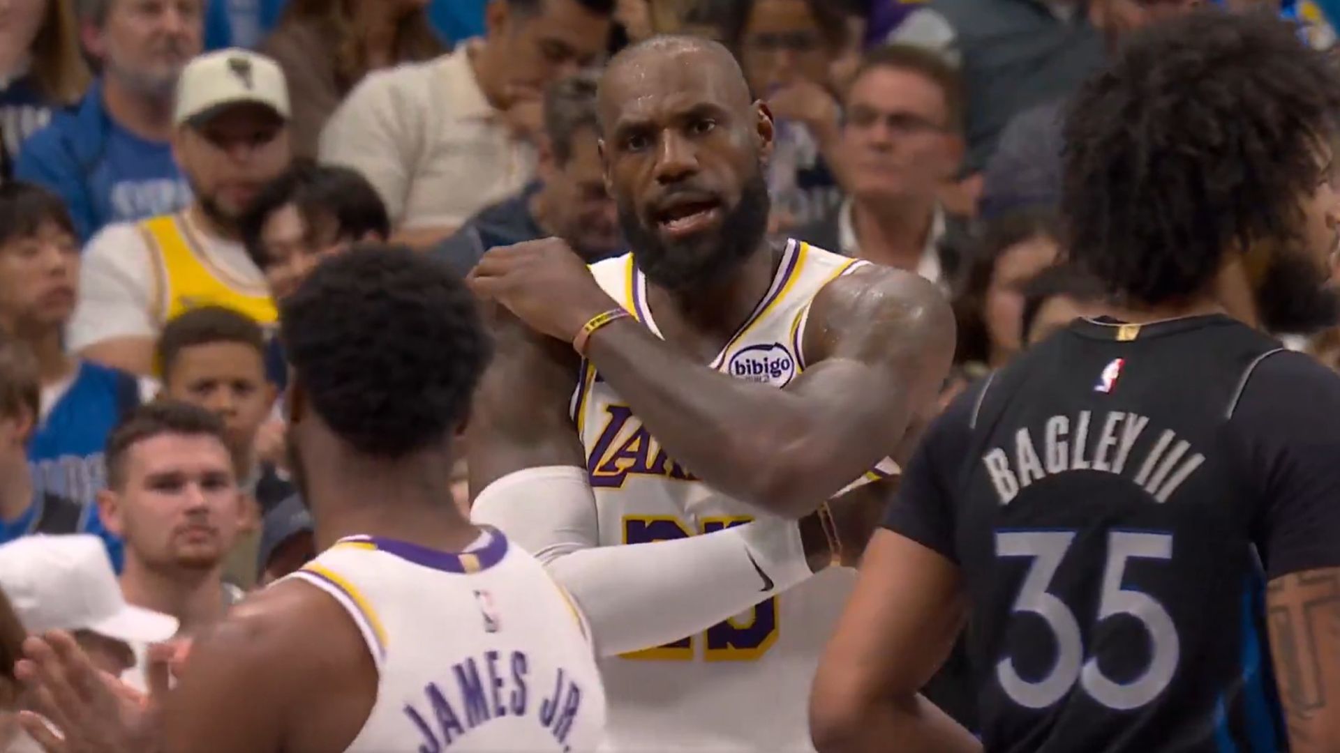 Durante el tercer cuarto del partido entre Los Ángeles Lakers y los Dallas Mavericks, cuando el equipo de Dallas iba 8 puntos por delante de los de Los Ángeles, Bronny James falló un pase sencillo que iba dirigido a LeBron. El base estadounidense estaba siendo presionado por un rival y al darle el balón a su padre cometió el error de hacerlo por arriba. Marvin Bagley III llegó a contactar con la pelota y esta salió por la línea lateral. El 23 de los Lakers no dudó en corregir a su hijo en medio del partido y le echó la bronca exigiendo que el pase fuera picado para que el defensor no lo cortara. Aunque sean compañeros y estén en la NBA, la vena paternal de LeBron James sale de vez en cuando mientras comparte minutos en cancha con su hijo Bronny.