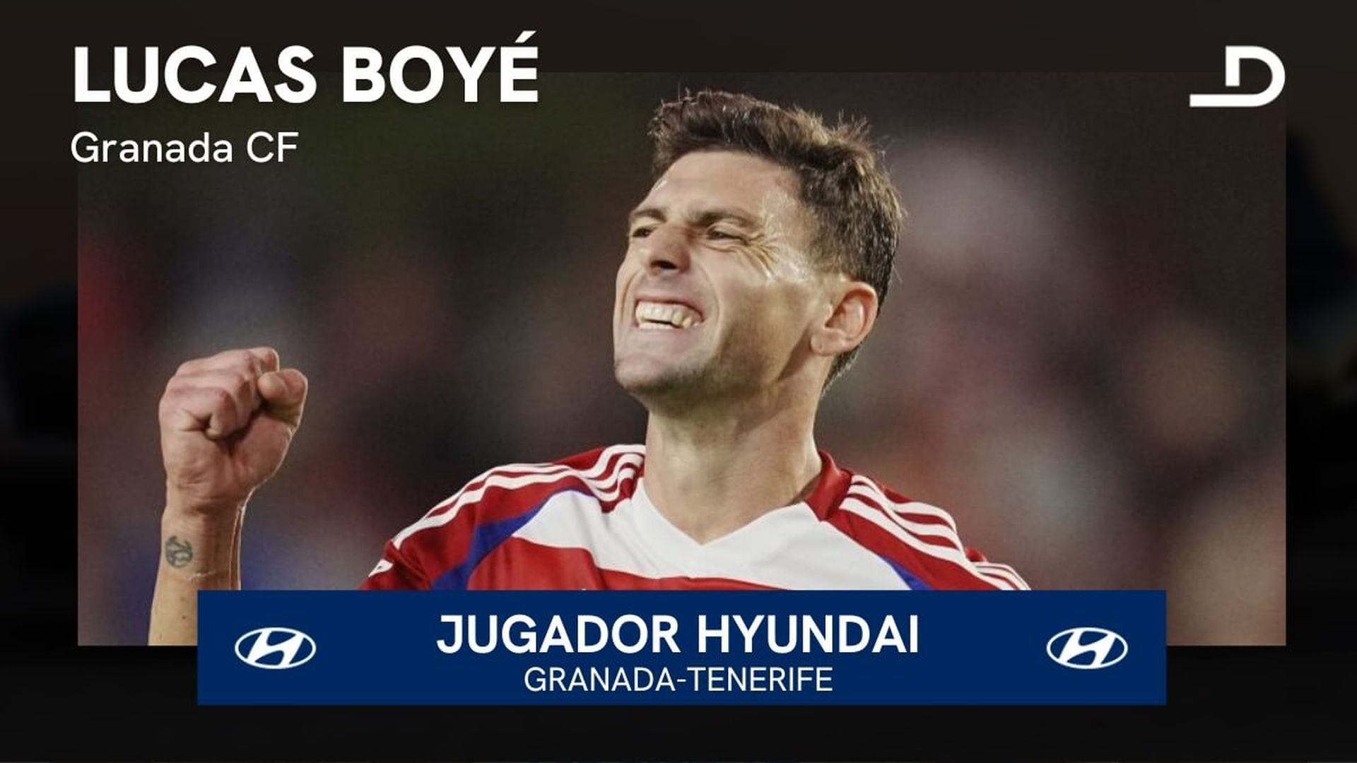 El Granada ha conseguido este sábado su tercera victoria consecutiva de la temporada ante el Tenerife. Un triunfo vital para acercarse cada vez más a la parte alta de la clasificación y con la actuación estelar de uno de sus hombres sobre el resto: Lucas Boyé, Jugador Hyundai del Granada-Tenerife. El futbolista argentino entró como un vendaval en el partido y disfrutó de la primera clara para el conjunto nazarí. En el 33' asistió a Uzuni en el segundo tanto del albanés, aunque no fue hasta el tramo final cuando por fin pudo ver portería. Ya con el Tenerife totalmente superado, Lucas Boyé cerró la cuenta con un doblete, el tercero del partido a asistencia de Ricard en el minuto 81 y el cuarto y último a placer tras un saque de esquina en la última jugada del choque. Por su asistencia y su doblete, Lucas Boyé es el Jugador Hyundai del Granada-Tenerife.