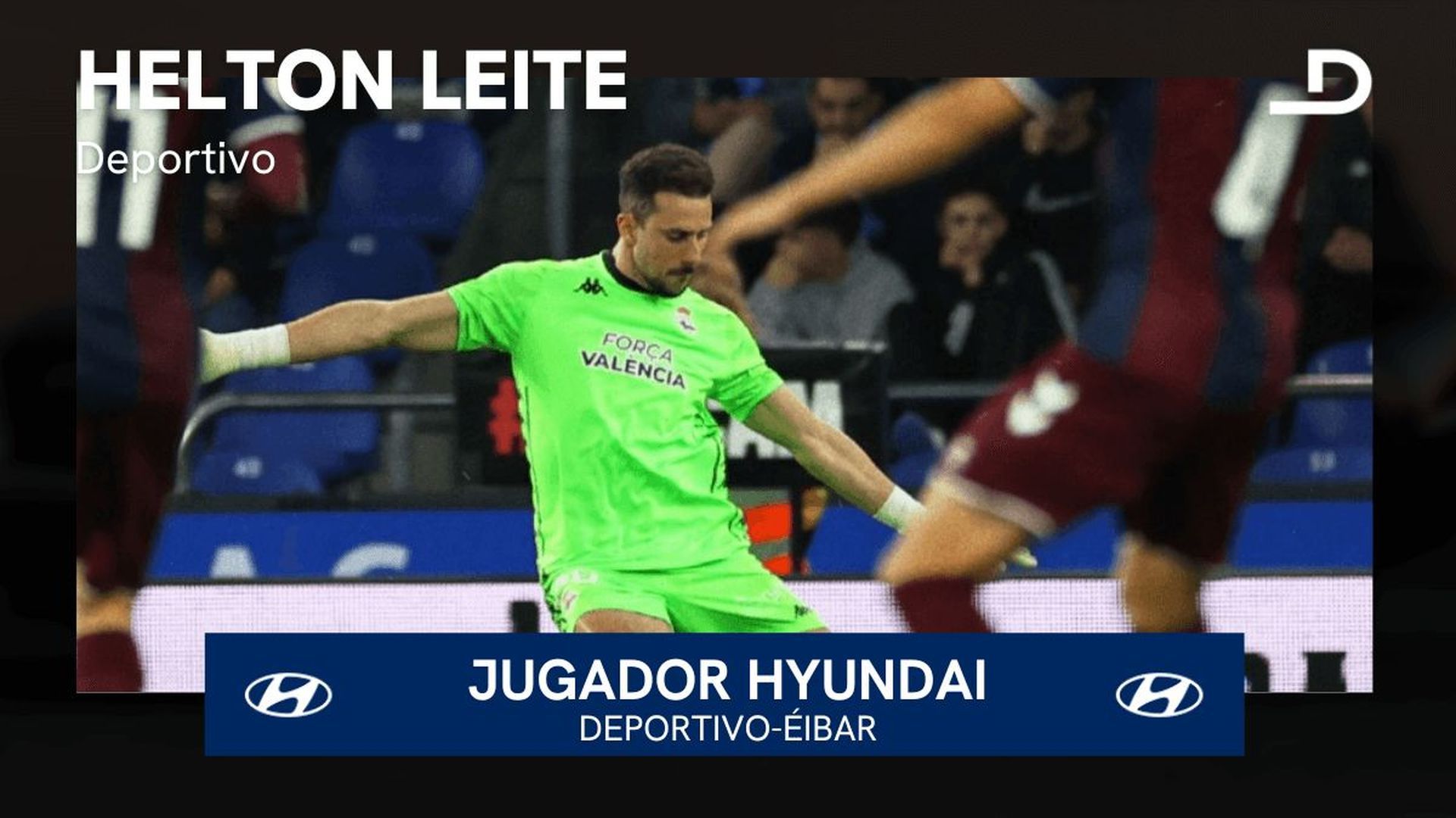 Helton Leite fue elegido el Jugador Hyundai del encuentro que se disputó este lunes en Riazor. El portero del Deportivo de La Coruña fue clave para mantener en la pelea por los puntos a su equipo. El cuadro de Óscar Gilsanz llegó vivo al tramo final del partido y Mario Soriano sacó un trallazo de su chistera para brindar los tres puntos al conjunto herculino. El tanto del exfutbolista armero desequilibró un partido marcado por la actuación de los porteros Helton Leite y Jonmi Magunagoitia, que sostuvieron a sus respectivos equipos hasta que Mario Soriano dio el triunfo al conjunto de Óscar Gilsanz, que sigue invicto como técnico deportivista.