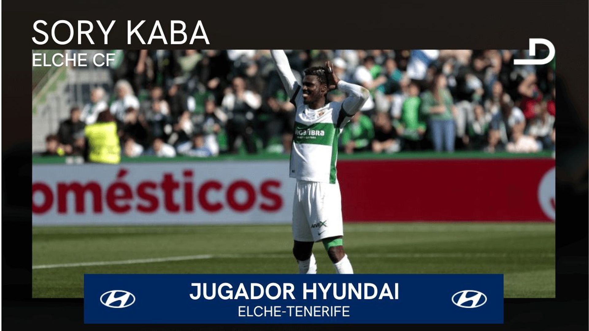 Sory Kaba fue elegido el Jugador Hyundai del partido entre el Elche y el Tenerife en el Martínez Valero por su completa actuación. El delantero guineano anotó el gol del triunfo de su equipo al materializar una pena máxima en el primer tiempo. Su partido en tareas ofensivas fue sobresaliente. Por todo ello, ElDesmarque le concede el honor de ser el Jugador Hyundai del partido.