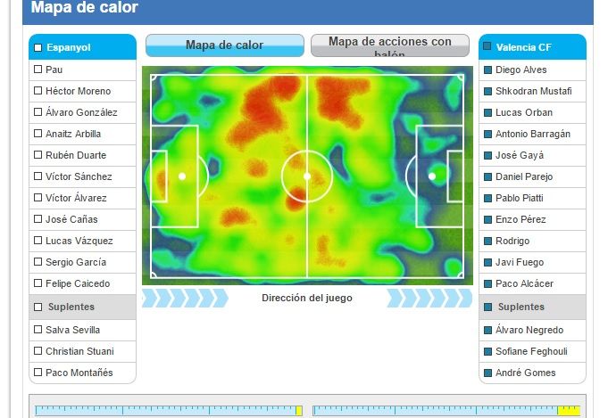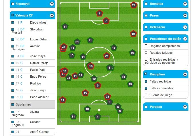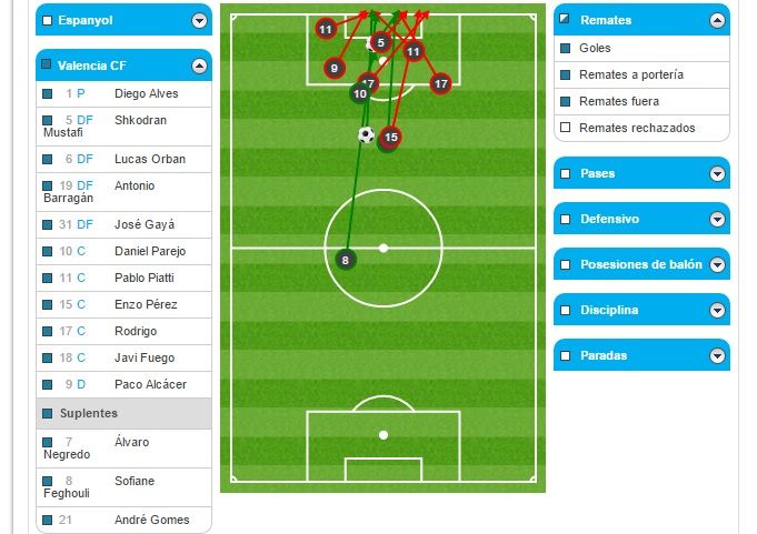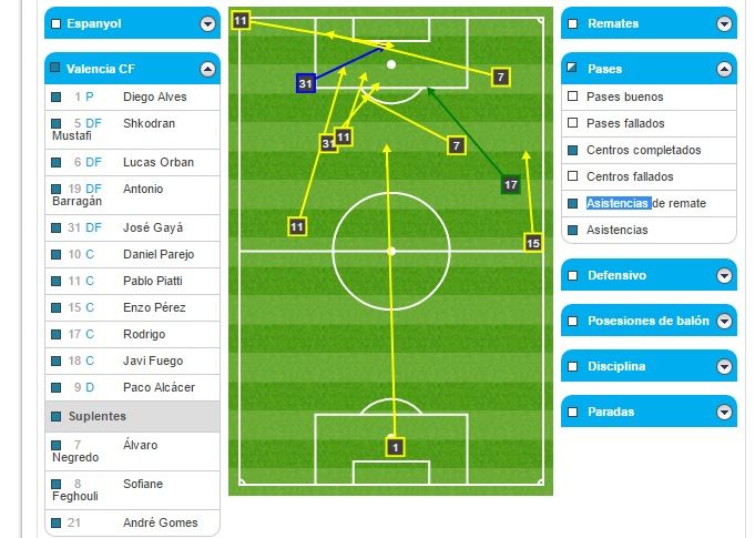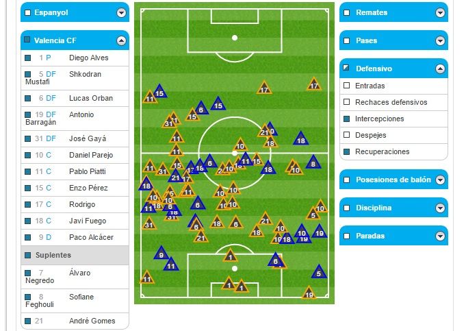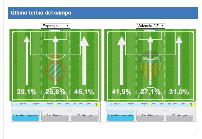 4.- Salida por bandas y Piatti-Gayà llevaron el pesoLas bandas le dieron mucha más profundidad al equipo que en partidos anteriores como el de La Rosaleda y Cornellà en Copa en donde el Valencia acabó llevando todo el peso ofensivo por el centro. A lo largo del partido los ché llevaron hasta el 41% de sus ataques por la banda de Gayà y Piatti que fueron un peligro constante para el Espanyol, pero en ocasiones ambos se anulaban porque pisaban las mismas zonas de campo, eso lo quiso aprovechar el Espanyol que también basó todo su juego de ataque por el flanco derecho en busca de esos huecos que podían dejar los dos jugadores valencianistas. En la segunda mitad el Valencia incrementó sus ataques por la izquierda hasta un 47%, lo que dice bien de la superioridad sobre la banda que ocuparon Soso y Rodrigo junto a Barragán.