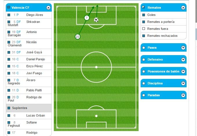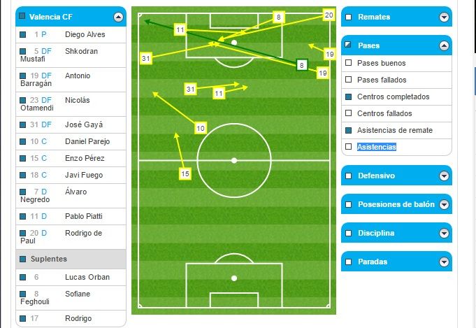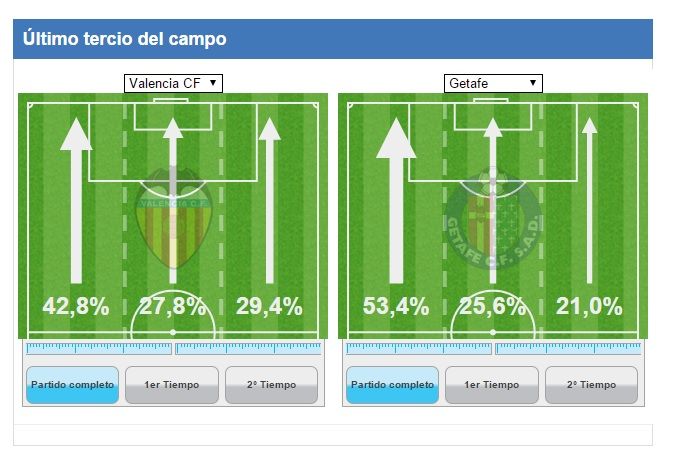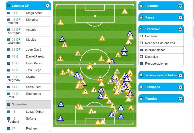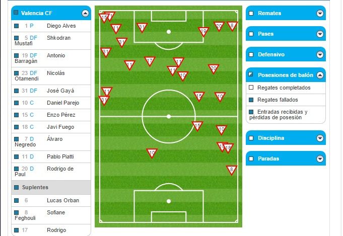 El Valencia CF no tuvo casi ocasiones en contra porque el equipo jugó muy adelantado y todos los regates completados y las pérdidas llegaron en campo rival. Eso complica mucho el juego a los equipos rivales porque para buscar las ocasiones tiene que recorrer 40 ó 50 metros para llegar a la portería de Alves. Excepto en los últimos cinco minutos que el conjunto azulón volvió a embotellar al equipo y se sufrió. Durante 80 minutos, el Valencia CF controló al rival haciéndole 'vivir' lejos de la portería del meta brasileño. Sólo hay que ver dónde se produjeron las pérdidas de balón: 19 en campo contrario por sólo 6 en el propio.