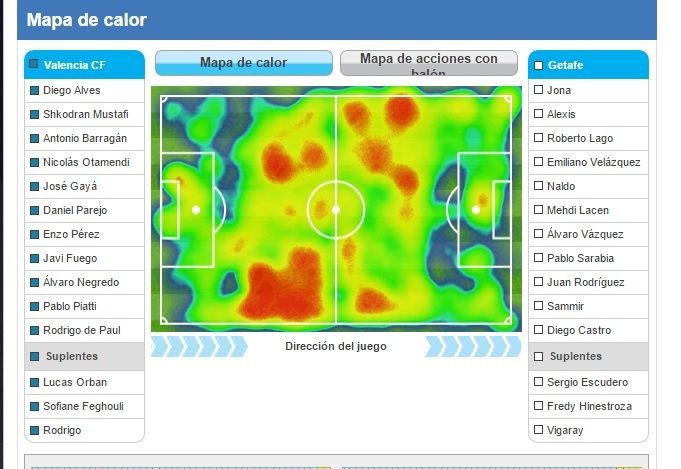La banda izquierda volvió a llevar todo el peso ofensivo del equipo valencianista, sobre todo porque Nuno le dio toda la banda a Barragán y eso le privó de llegar más fresco a línea de fondo y encima el Getafe aprovechó su banda para generar peligro. En los primeros minutos la banda izquierda fue un dolor de cabeza para Alexis. El largo recorrido, la velocidad y la versatilidad y calidad de Piatti y Gayà volvieron a generar todo el peligro ché y el Valencia volvió a apoyarse en ese flanco para buscar el gol. Las llegadas a línea de fondo eran constantes y los centros peligrosos fueron llegando uno detrás de otro. En cambio el conjunto azulón aprovechó la soledad de Barragán para buscar los dos contra uno: Diego Castro y Roberto Lago siempre pusieron en jaque al valencianista, con la ayuda de Lacen. De Paul actuó como enganche y dejó la banda derecha en exclusiva para Barragán y le quedó grande el experimento a Nuno. El mapa de calor desvela los problemas que tuvo el andaluz con el Getafe.