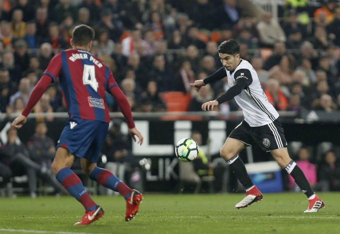 Con ese empuje, el propio Santi Mina remató en plancha un córner sacado desde la derecha por Parejo que se fue alto por bien poco. En esa jugada, Kondogbia fue objeto de penalti por parte de Postigo no señalado. El hecho es que el Valencia proponía algo más y así Carlos Soler, tras un recorte, la tiró con la izquierda un metro por encima del larguero granota. Tanto insistió el Valencia que, al siguiente lanzamiento de córner Mina, esta vez sí, le gana la partida a Rober Pier y de un espléndido cabezazo logró el 1-0. Casi sin tiempo para celebrarlo, el Levante empataba a la siguiente jugada. El Valencia cedía un córner, que el Levante sacaba en corto para, tras una jugada ensayada, dejar a Postigo solo que remató a placer el 1-1. La locura goleadora dio pase a una fase en la que el Valencia CF volvió a dominar el juego y, por momentos, encerró al Levante en su área. El balón se paseaba por delante de Oier pero no encontraba rematador. Guedes, sin acierto, lo intentaba desde lejos. El Levante fiaba su futuro a las contras, como la que protagonizó Ivi y puso en algún apuro que otro a Neto. Eran acciones aisladas porque quien más peligro generaba el Valencia que, al filo del descanso, gozó de una gran ocasión para desnivelar el derbi. Gayà puso un centro medido desde la izquierda que Mina, de forma acrobática, remató al larguero. No se movería el electrónico y con el empate a 1 ambos contendientes se retiraron al túnel de vestuarios.