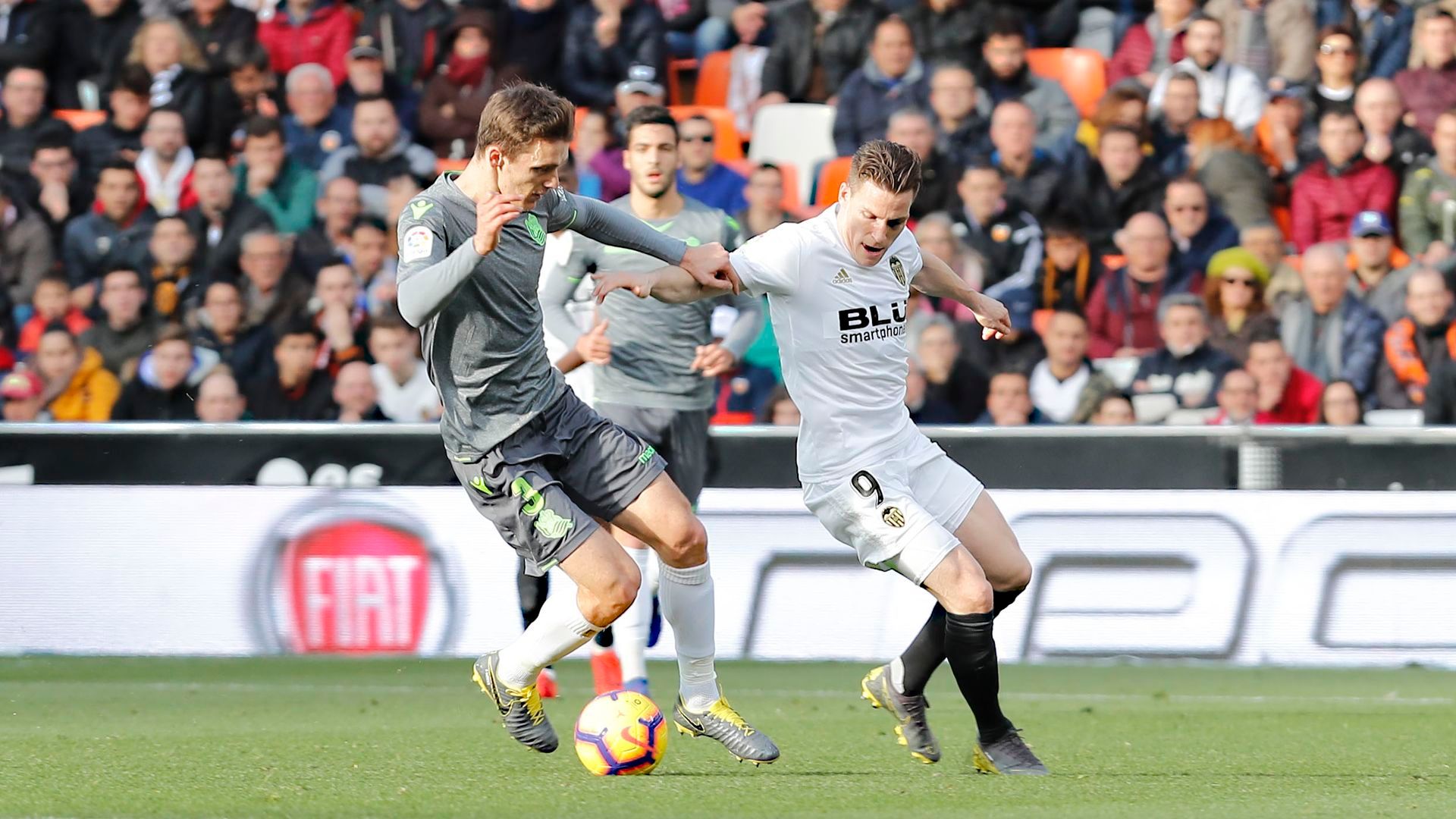 Lo que sí faltaba era profundizar ya que Neto estaba siendo un espectador en media hora que se llevaba disputada de juego. Un partido sin ocasiones en 30 minutos. La Real debía transformar la posesión en velocidad y verticalidad. El susto para los donostiarras llegó en el 35 después de que Santi Mina se revolviera muy bien dentro del área defendida por Rulli, y su centro posterior no lo pudo aprovechar nadie. Dos minutos después Oyarzabal se entretuvo demasiado después de recibir un balón en la frontal, y cuando se disponía a disparar ya tenía a un defensor local encima. Ritmo y saber romper las líneas del Valencia eran los debes de los realistas en lo que se llevaba disputado de encuentro. Por el contrario en defensa el equipo estaba muy serio. En los dos últimos minutos antes del descanso el Valencia apretó para tratar de llegar con ventaja al arranque de la segunda parte, y así poder jugar con el marcador a favor, pero la primera parte no dio para más y los jugadores se retiraron a vestuarios con 0-0.
