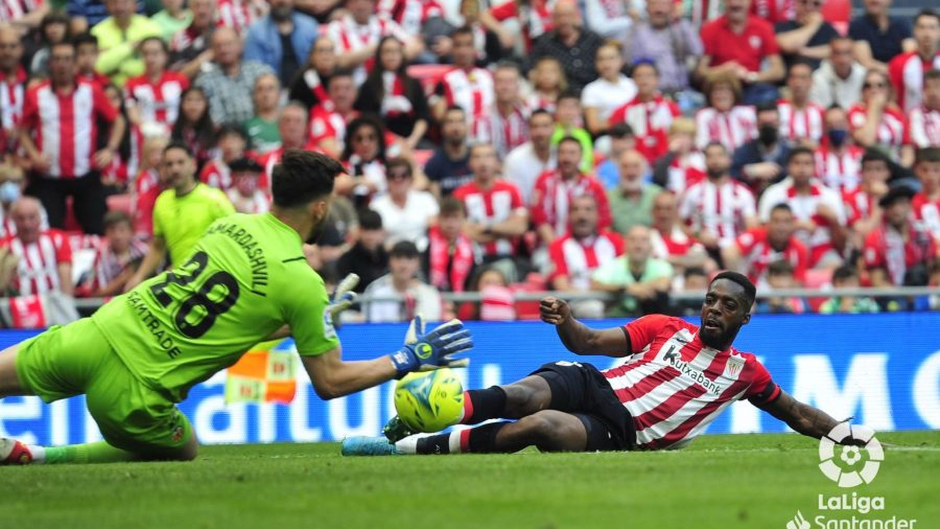 Otro pase largo de Diakhaby forzó un córner al cuarto de hora de partido antes de una acción de Mamardashvili que él mismo se encargó de arreglar. Falló en la salida pero después detuvo un buen disparo de Raúl García. El rechace dejó solo a Iñaki Williams, pero estaba en fuera de juego aunque su remate se marchó fuera. Los mismos protagonistas pasada la primera media hora de juego se enfrentaron con un resultado similar: Giorgi ganó la partida.