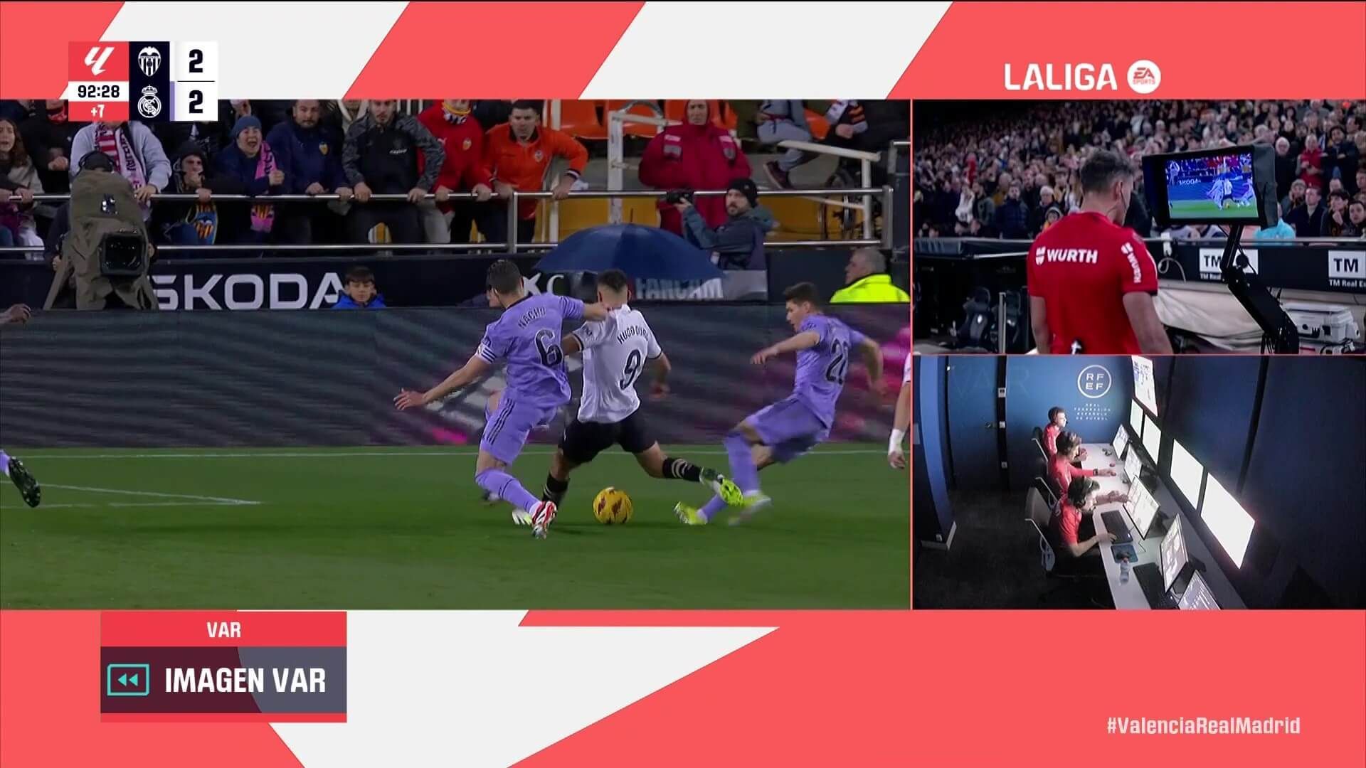 Después, Hugo Duro reconoce que no es penalti. "Me resbalo porque me da Fran. Toca el balón antes, se lo he dicho a él que no era penalti" En su análisis del partido reconoce Nos ha hecho mucho daño el gol en el último minuto. El Madrid es un equipazo. En la segunda parte hemos tenido ocasiones y sabemos sufrir. Quiero darle la enhorabuena a Mestalla porque han mostrado el respeto que hablamos del racismo. Me alegro, han apretado porque estamos en nuestra casa es normal.