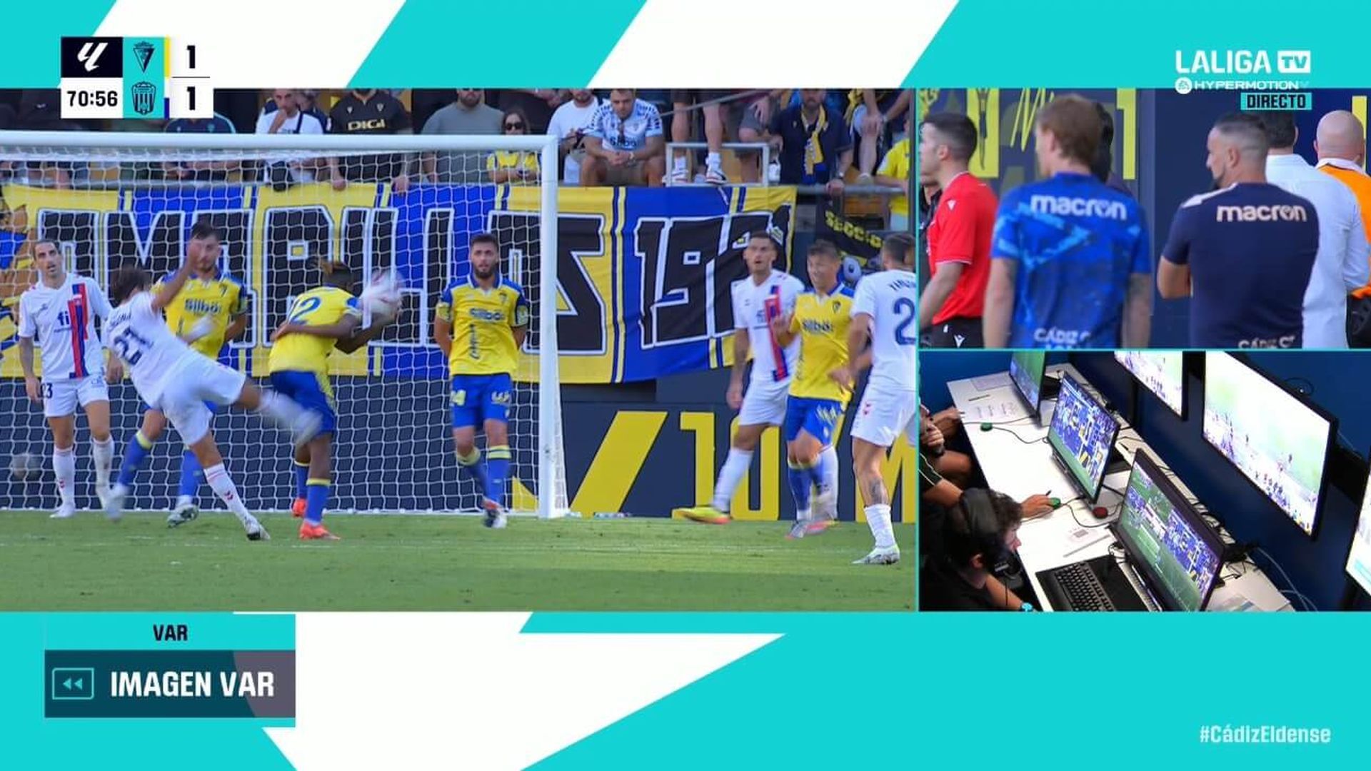 CádizLa segunda parte entre el Cádiz y el Eldense fue otro partido en clave amarilla. Los locales salieron a morder y comenzaron a acumular ocasiones a través de disparos lejanos y de centros laterales en los que Chris Ramos y Mwepu tomaron la iniciativa. Tanto había cambiado el partido que Ontiveros, con un disparo lejano, anotó un auténtico golazo para empatar. Una diana que ya llevaba varias semanas intentando y que sin duda es una de sus especialidades. Pero la alegría duró muy poco en el Nuevo Mirandilla. Y todo ello debido a una polémica decisión arbitral. Tras la igualada, el Eldense continuó a lo suyo mientras el Cádiz se lanzó en busca del segundo. Pero apenas hubo tiempo para saborear que el resultado ya era de 1-1. Un disparo desde la frontal por parte de un jugador del Eldense salió rechazado tras dar en Kouamé. Los jugadores visitantes pidieron penalti y el colegiado paró el encuentro para revisar la acción.