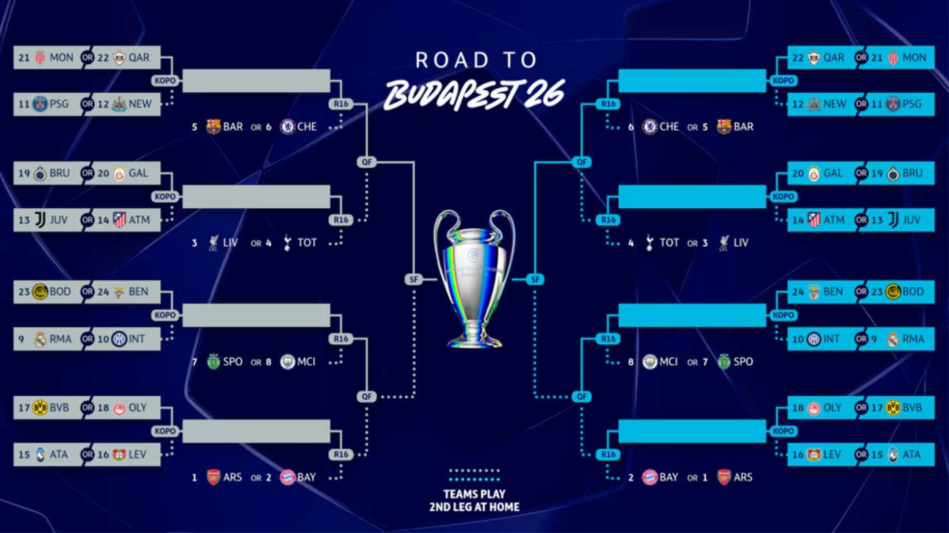 De momento, cada equipo del playoff tiene dos posibles rivales. El 9º y el 10º se enfrentarán al 23º y 24º, y así sucesivamente. En el sorteo del próximo viernes se desvelarán estos emparejamientos y se ubicará a cada club en un lado del cuadro. Tres semanas después, en el sorteo de octavos se ubicará a los ocho primeros clasificados, que también tendrán dos posibles rivales dependiendo de por qué lado del cuadro vayan.