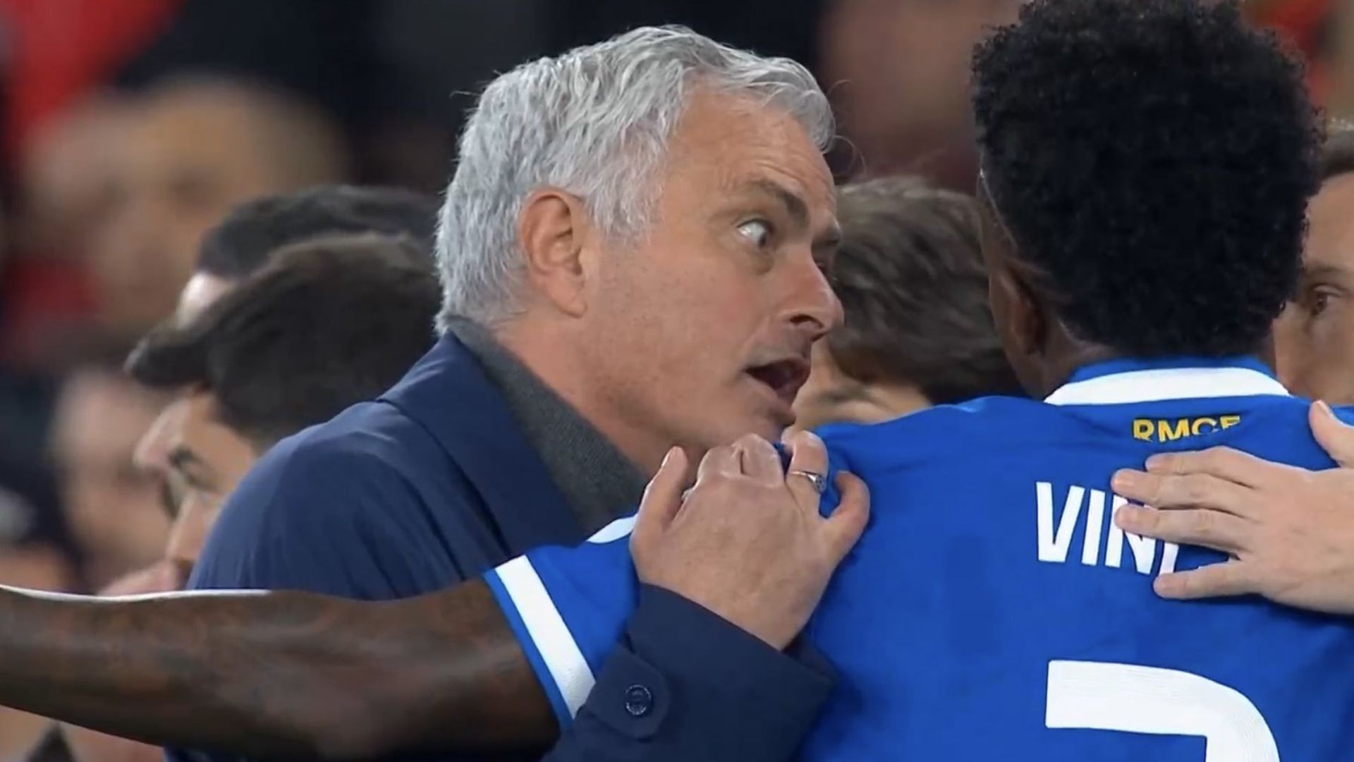 Ambos equipos se enzarzaron y acabaron cerca de su banquillo, una escena que dejó momentos curiosos. Como por ejemplo el que protagonizaron Mourinho y Vinicius mientras el partido estaba parado. En ese momento, con el jugador del Madrid algo alterado, el técnico portugués se fue hacia él y lo abrazó para calmarlo dentro de su nerviosismo.