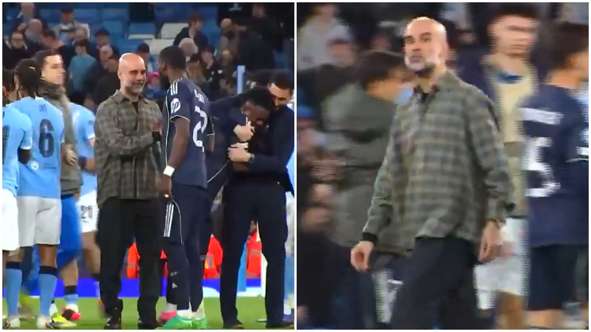 El enganchón de Rüdiger y Pep Guardiola tras la victoria del Real Madrid: apretón de manos, palmada y besito