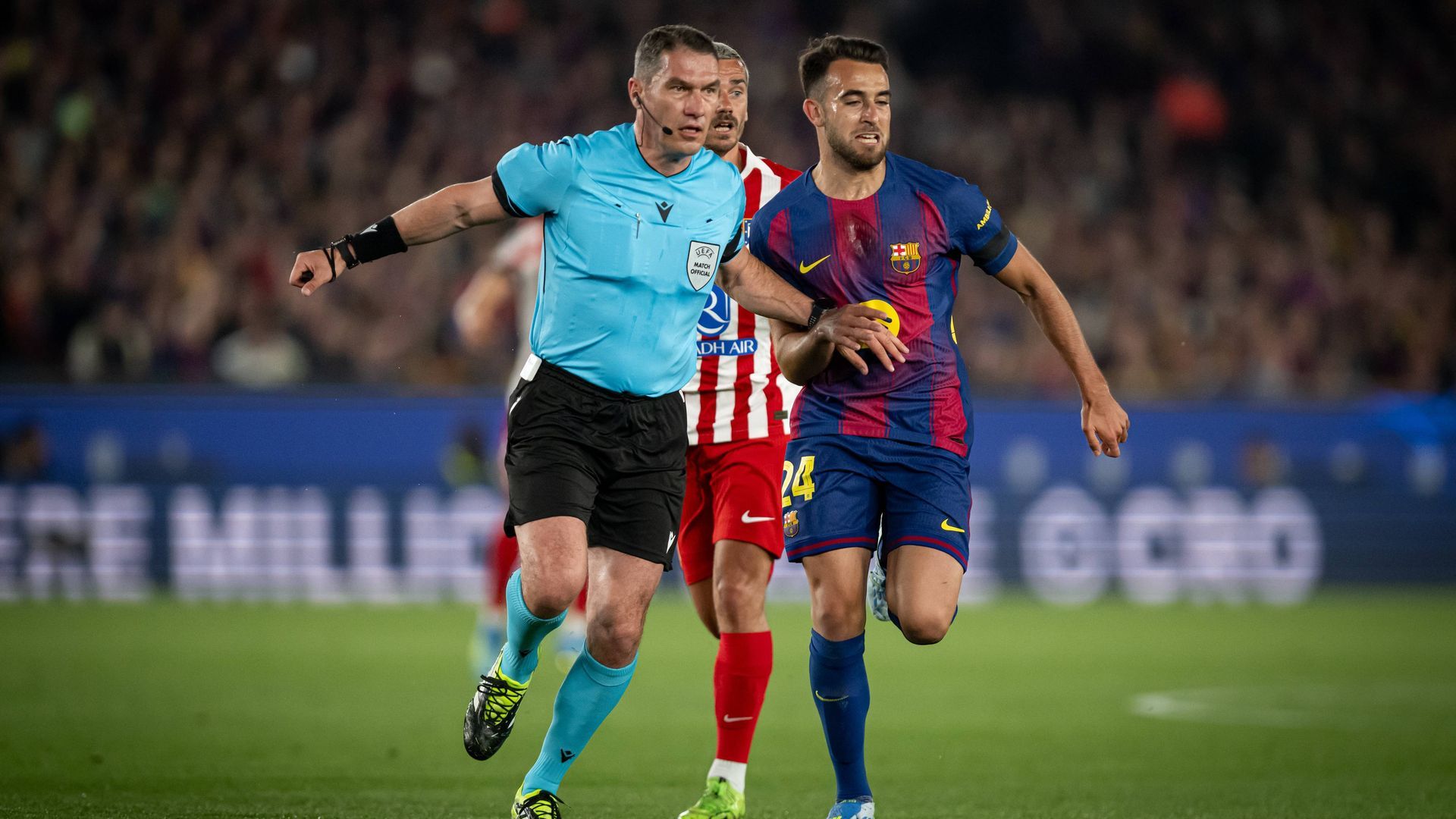 El trencilla principal, de frente a la acción, vio cómo el zaguero colchonero plantaba el balón con las manos en el área tras la cesión del portero Juan Musso. El Camp Nou no daba crédito y exigió un penalti que pudo alterar el resultado final.