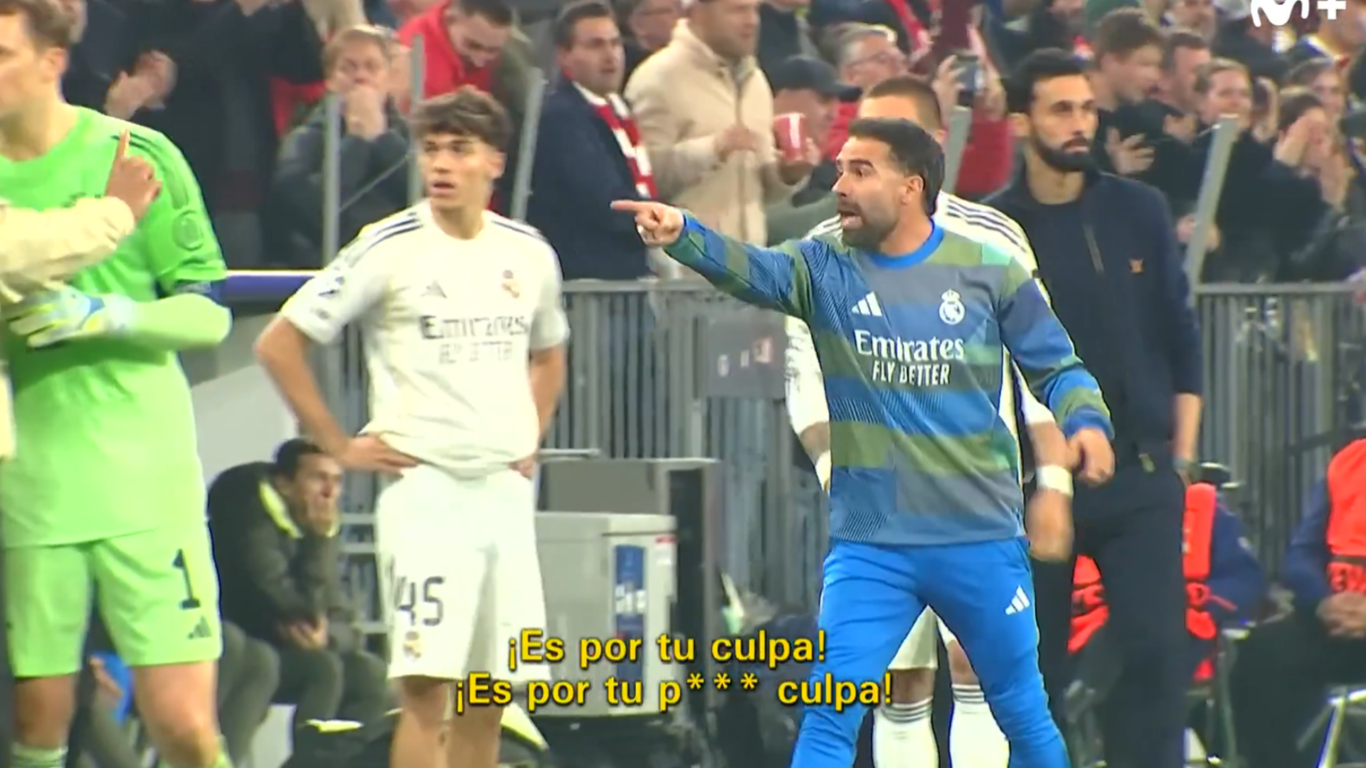 "¡Es por tu culpa! ¡Es por tu puta culpa!", dijo Carvajal señalando al cuarto árbitro y saliendo del banquillo tras el gol de Luis Díaz que decantaba la eliminatoria para los alemanes. Luego se giró 90 grados y se dirigió directamente a Vincic, el colegiado principal, repitiendo la misma frase: "¡Es por tu culpa! ¡Es por tu culpa! ¡Es por tu puta culpa!".