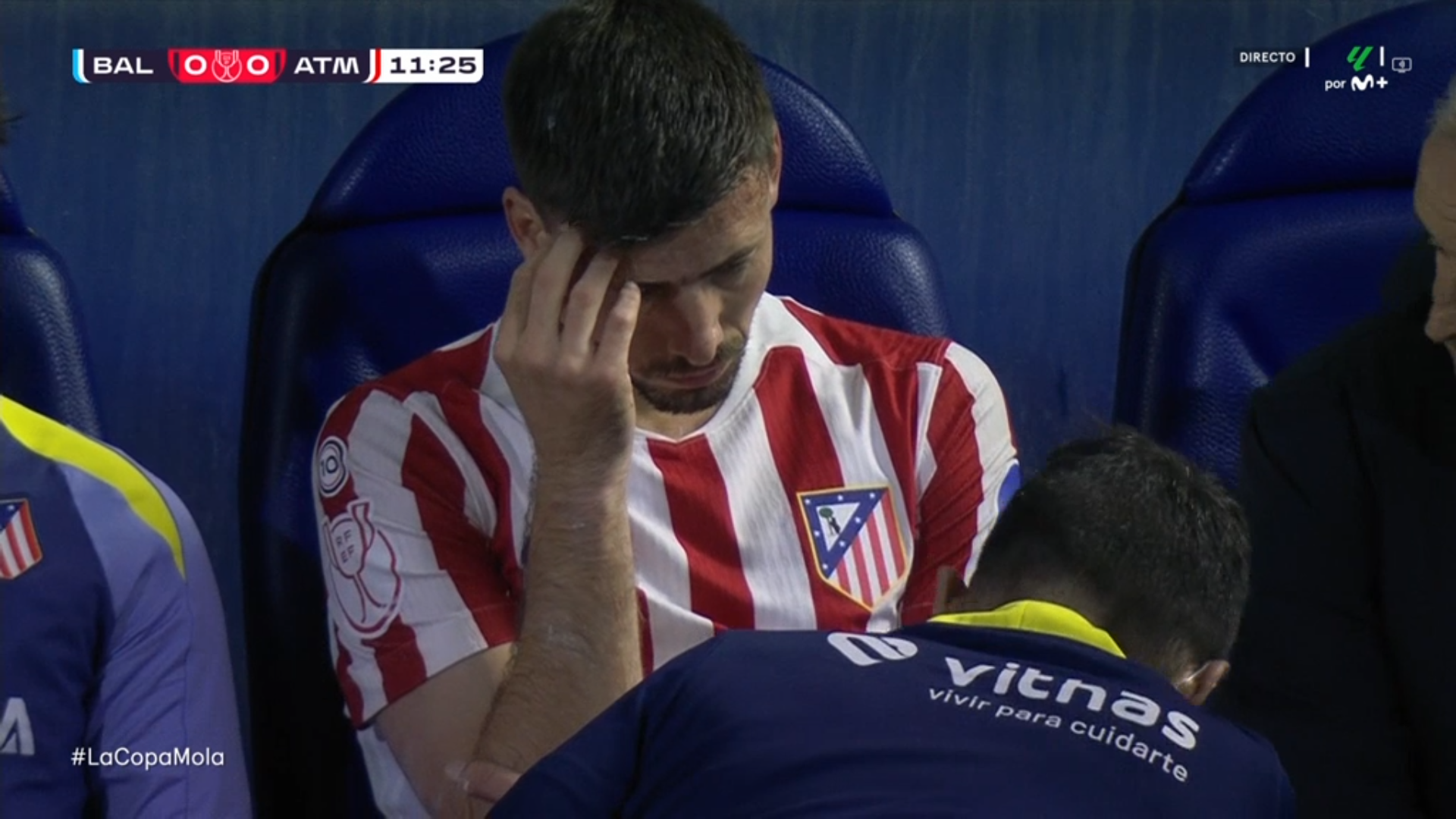 La realización televisiva pudo captar en directo los gritos del central tirado sobre el césped. Los gestos invitaban a pensar en lo peor mientras los servicios médicos del cuadro colchonero le atendían aún en el campo. Finalmente, pese a la alarma generada, pudo abandonar el terreno de juego por su propio pie.
