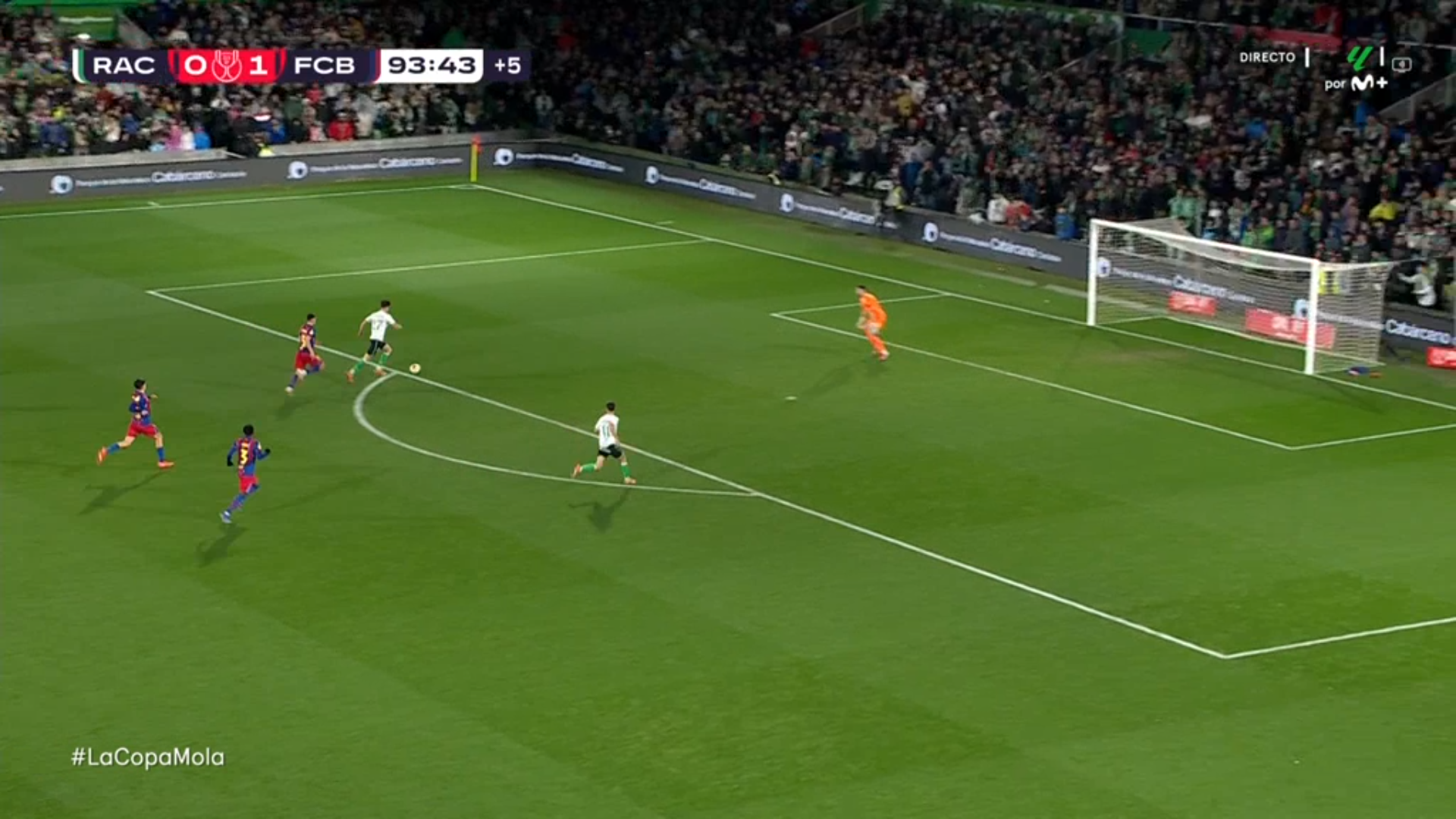 Con 4 minutos de añadido, el equipo de José Alberto apretó hasta el último segundo en busca de un gol que forzara el tiempo extra. La ocasión fue inmejorable: Manex, que sólo tiene 18 años, ganó la espalda a Cubarsí y se aprovechó de la mala posición de Gerard Martín rompiendo el fuera de juego. Tiró de velocidad y se plantó, junto a Andrés Martín, completamente solo ante Joan García. Un dos para uno.