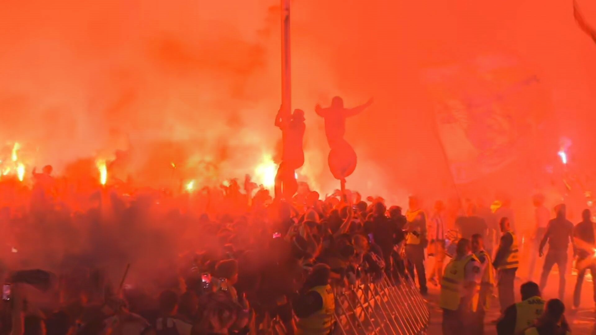 Los jugadores, de hecho, acabaron bajándose del bus poco antes de llegar a Anoeta. Completaron los últimos metros a pie, en medio de fuertes medidas de seguridad y casi sin poder verles las caras debido al humo de las bengalas, recibidos casi como héroes antes de una noche que puede ser histórica.