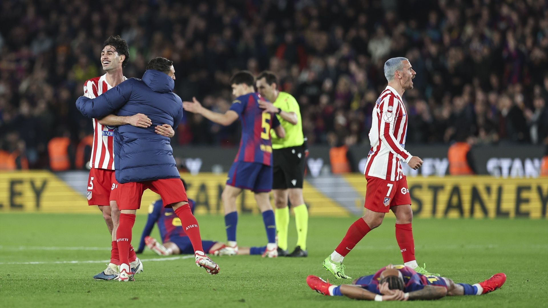El Atlético hizo anoche un importante ejercicio de resistencia para llevarse el pase a la final de Copa del Rey. Tras el 4-0 cosechado en la ida, los de Simeone supieron aguantar el empuje culé en la vuelta para terminar pasando de ronda a pesar de la derrota en el Spotify Camp Nou. Una victoria que los colchoneros celebraron por todo lo alto, muy especialmente Antoine Griezmann.