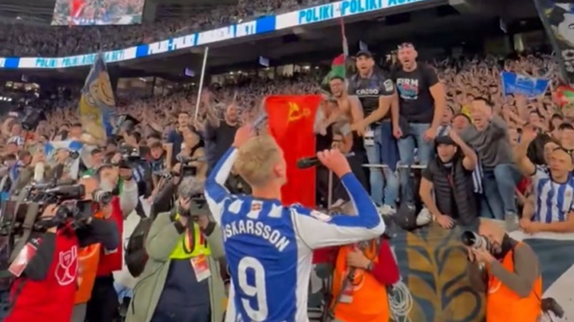 Anoeta se convirtió en un manicomio donde cada uno lo celebró a su manera. La afición aguantó en las gradas mucho tiempo mientras los jugadores, entre abrazos y lágrimas, fueron celebrándolo con los diferentes sectores y de maneras muy variopintas. Banderas, cánticas, palmas, etc. Hubo tiempo para todo. Hasta para que Orri Óskarsson entonara con la grada la famosa canción de Copa que tienen al islandés como protagonista.