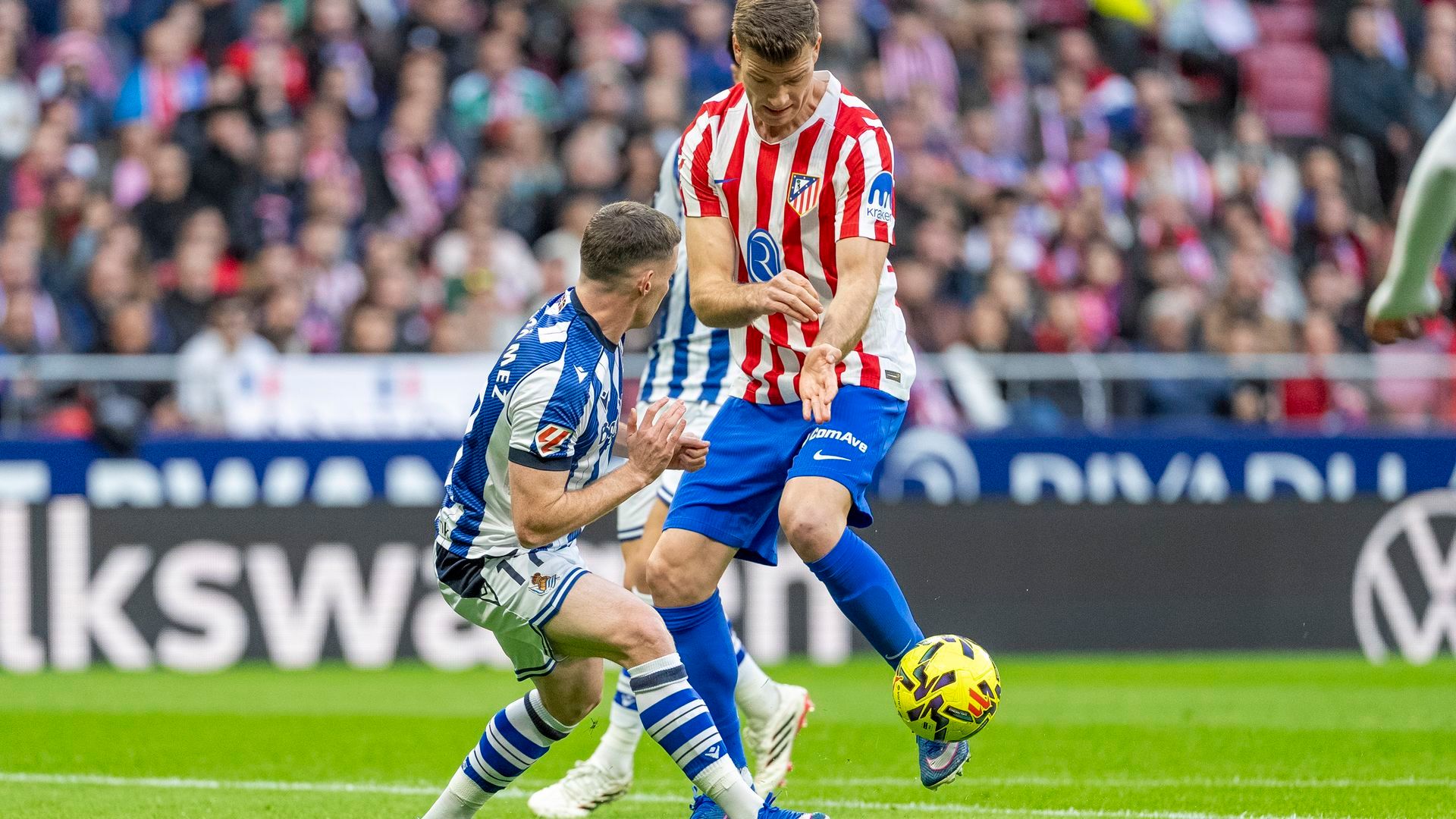Al hablan del Atlético, el defensor txuri urdin puso el foco en la banda derecha colchonera: "Tanto en la ida como en la vuelta, Giuliano me hizo sufrir. Repite muchos esfuerzos, entonces habrá que estar a la altura, pero con ganas. Estamos preparados, sabemos que ellos aprovechan mucho su banda derecha y vamos a intentar tener el balón para que no puedan salir tanto en contraataque. Ellos al espacio son peligrosos".