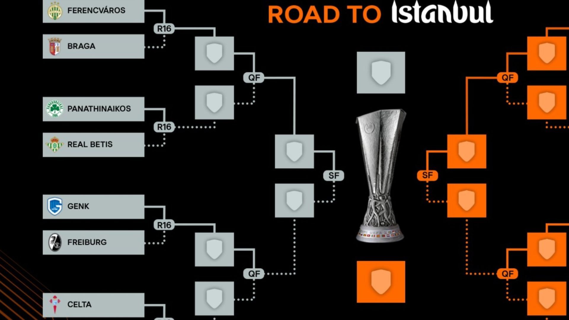 El camino a una presumible final podría pasar por eliminar a Panathinaikos en octavos de final, Braga en cuartos y Olympique de Lyon, al que ya ganó en la fase de liguilla, en unas supuestas semifinales. Esa sería la hoja de ruta hasta alcanzar la tan soñada final que se celebrará el próximo 20 de mayo en Estambul. De esta manera se asegura evitar hasta una posible final al Aston Villa, quizás el otro gran favorito para levantar el título. Sin lugar a dudas el otro lado del cuadro será mucho más exigente, por lo que en cualquier enfrentamiento se pasarán apuros. Oporto, Nottingham Forest, Stuttgart y Roma son los otros grandes rivales que ha evitado el Real Betis.