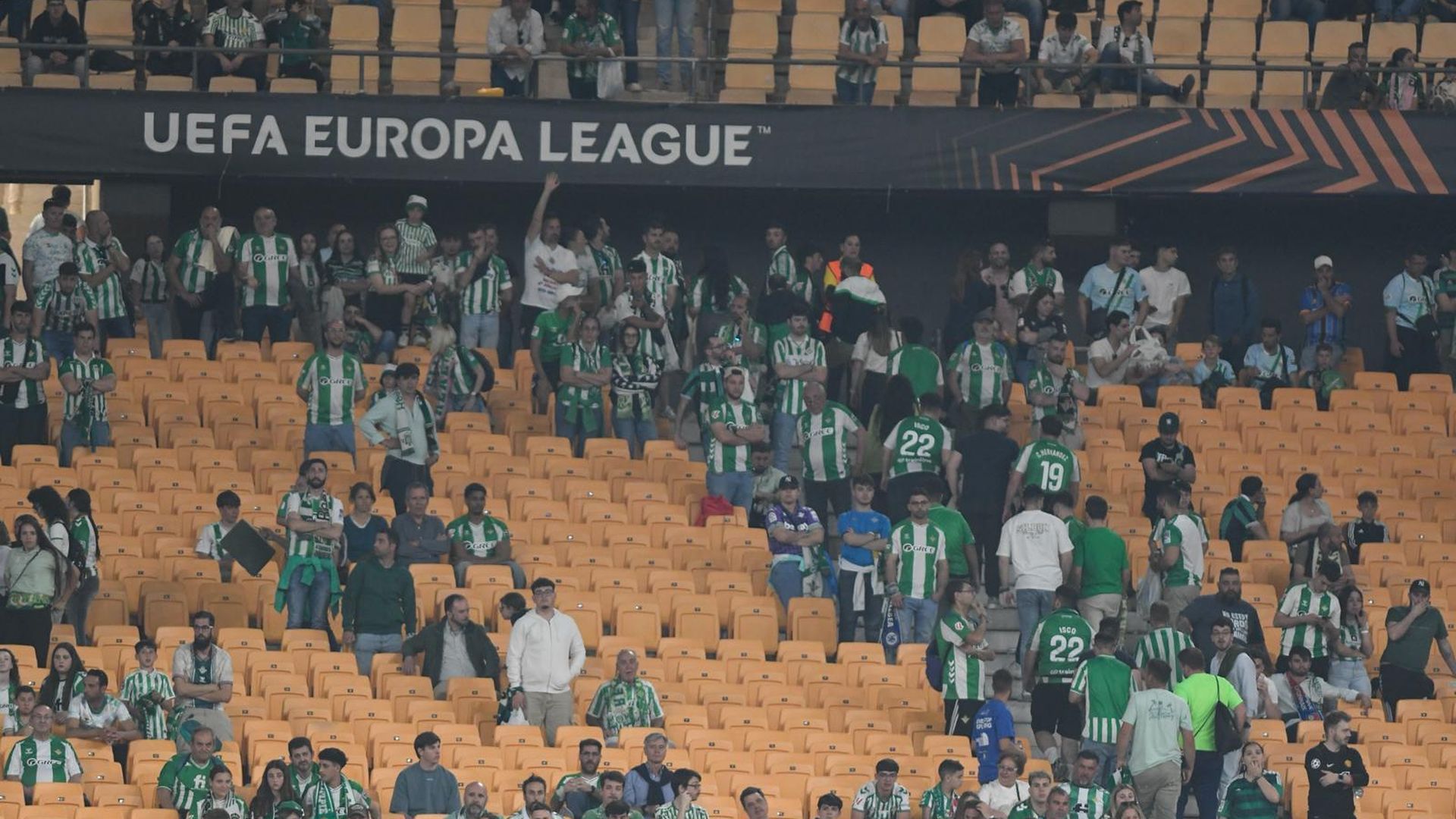 Totalmente surrealista lo que ocurrió este jueves en los minutos finales del Real Betis - SC Braga. Una escena que por momentos ocasionó cierto pánico y desconcierto entre los aficionados, llamados a desalojar el estadio cuando todavía quedaban unos diez minutos para que concluyese la eliminatoria. Todo ocurrió en el tiempo añadido. Desde la megafonía de La Cartuja se advirtió a los más de 66.000 asistentes que por favor abandonasen el campo, aludiendo motivos de seguridad. En primera instancia generó desconcierto entre los béticos pero los altavoces volvieron a sonar una segunda vez. "Por motivos de seguridad pedimos a todos los asistentes que abandonen el estadio", insistían. El club informa que se trató de un error de la UCO (Guardia Civil) y no de los verdiblancos.