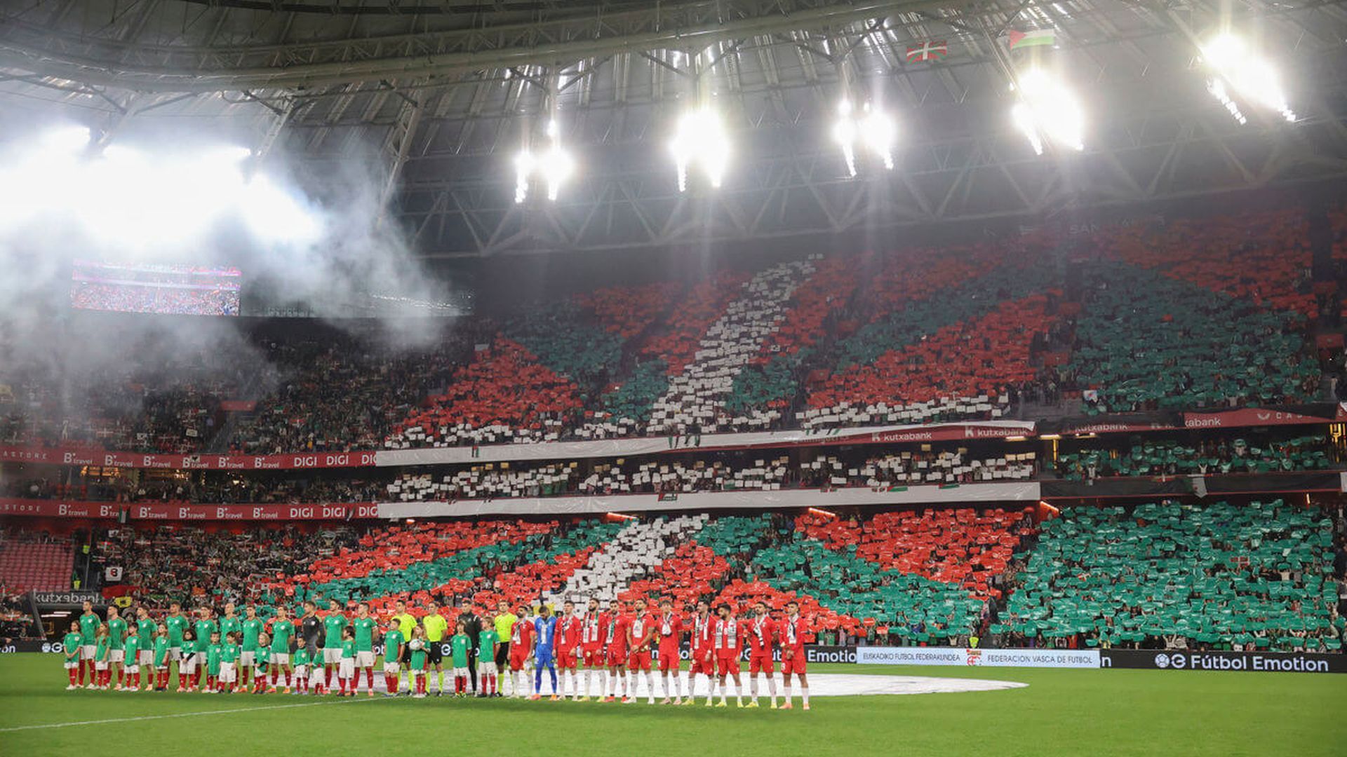 San Mamés se engalana para el Euskadi-Palestina con ikurriñas y peticiones de "parar el genocidio"