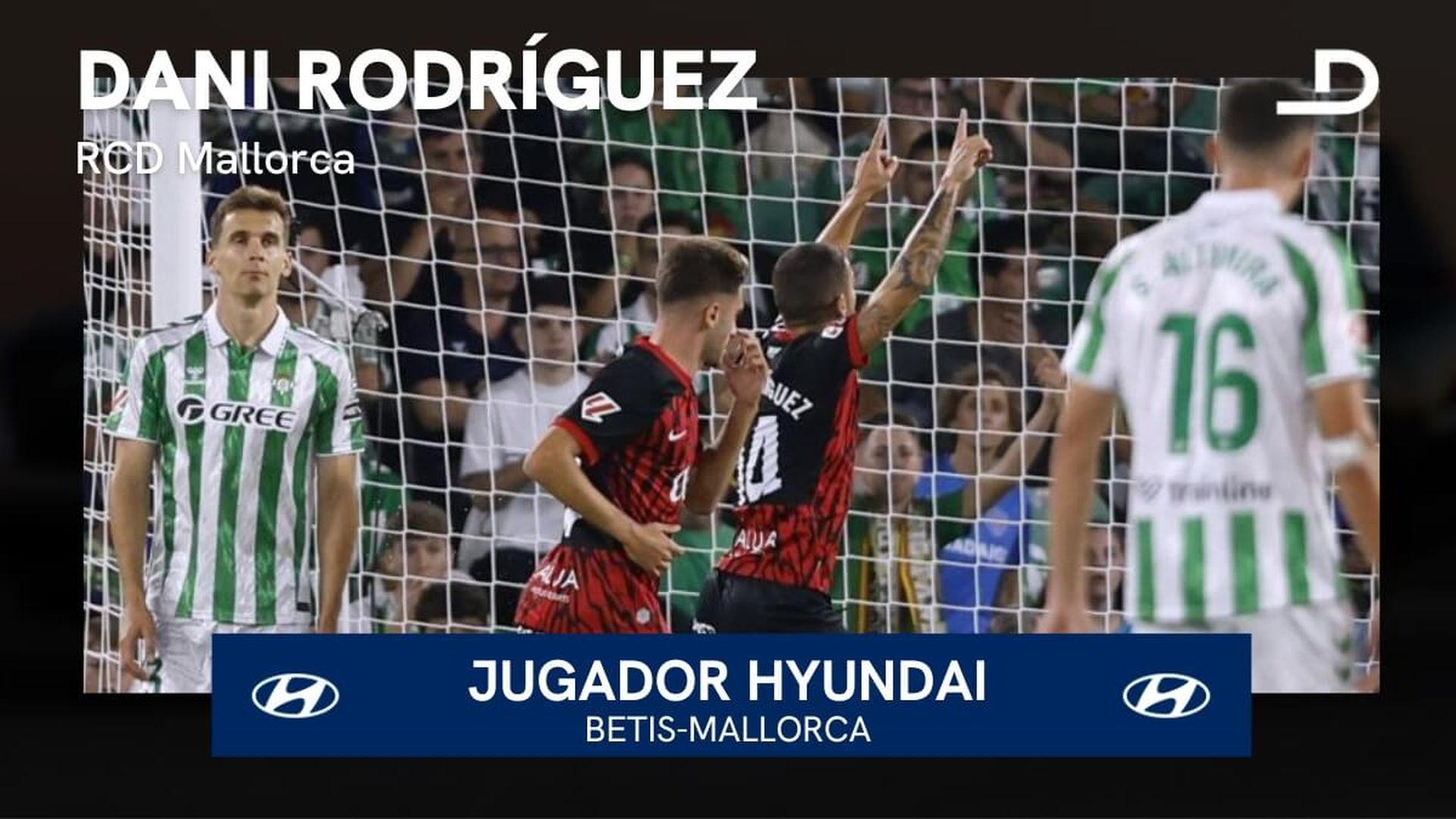 SevillaEl Real Mallorca se ha impuesto este lunes al Real Betis en el Benito Villamarín por 1-2 en el encuentro correspondiente a la jornada 6 de LALIGA EA Sports. El futbolista más destacado de la noche fue el visitante Dani Rodríguez, autor del primer tanto de los baleares y quien ha demostrado su calidad durante todo el encuentro. Poco después de que Lo Celso adelantara al Betis, Dani Rodríguez apareció para batir a Rui Silva con una gran definición a pase de Larin. No fue solo el gol, sino que de las botas del centrocampistas nacieron las acciones más peligrosas y con más sentido de los de Arrasate. Una pieza clave para que los tres puntos volaran de Heliópolis. Por esa completísima actuación: Dani Rodríguez, Jugador Hyundai del Betis-Mallorca.
