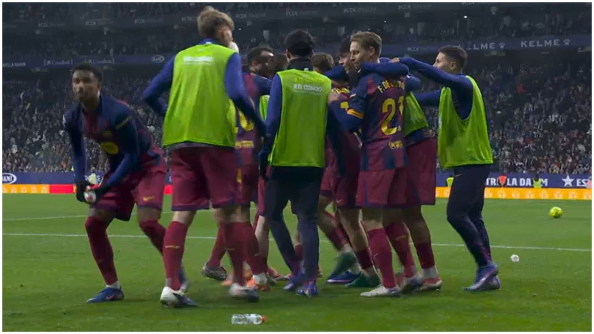 La afición del Espanyol lanzó objetos a los jugadores del Barça tras la celebración de Fermín