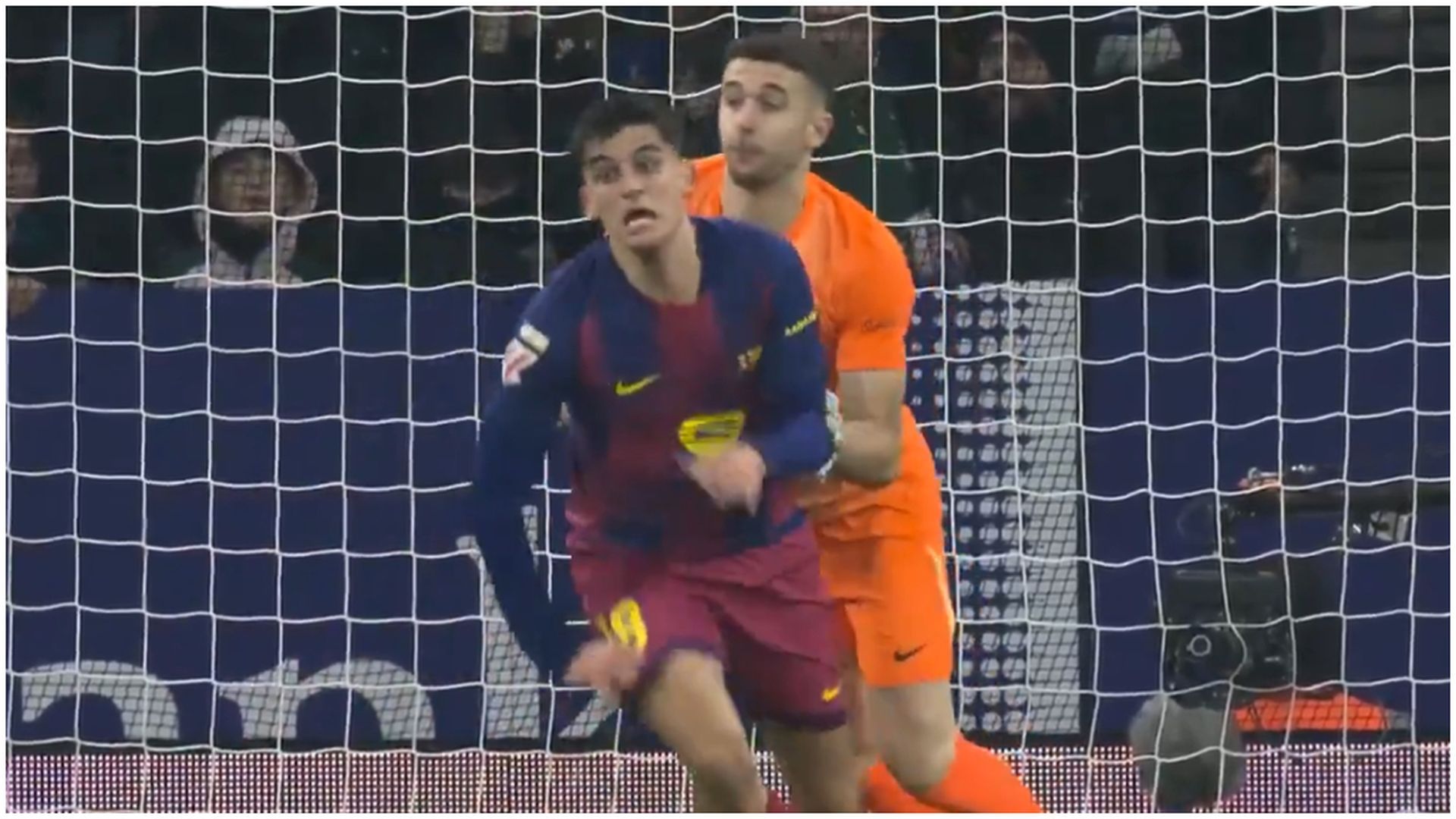 La jugada comenzó con Roberto del Espanyol intentando batir a Joan García en un mano a mano. El disparo del delantero salió centrado, y el guardameta reaccionó con reflejos excepcionales para repelerlo. En la acción siguiente, Joan necesitó empujar ligeramente a Gerard Martín, que estaba bloqueando parcialmente su visión, para poder intervenir de nuevo y permitir que el central azulgrana metiera la pierna y despejara el peligro.