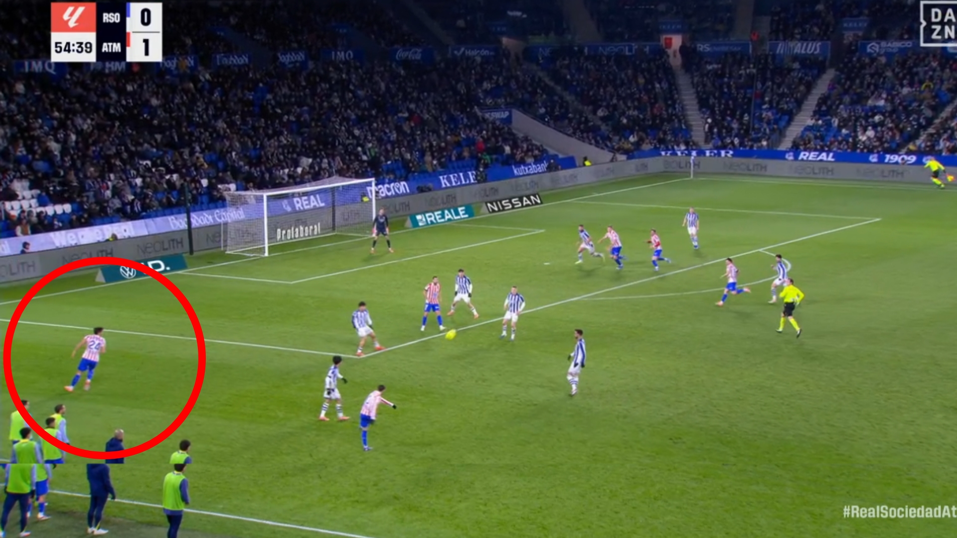 La jugada en cuestión ocurre a los 55 minutos. Julián conduce en exceso en el centro del campo y está a punto de perder la pelota. Koke la recoge y se la da a Le Normand, que realiza una conducción de 15 metros, abre a Baena a la izquierda y le dobla por el costado zurdo. Hancko, que por entonces era el lateral, llevaba ya varios segundos a la altura de Sorloth, casi como segundo delantero.