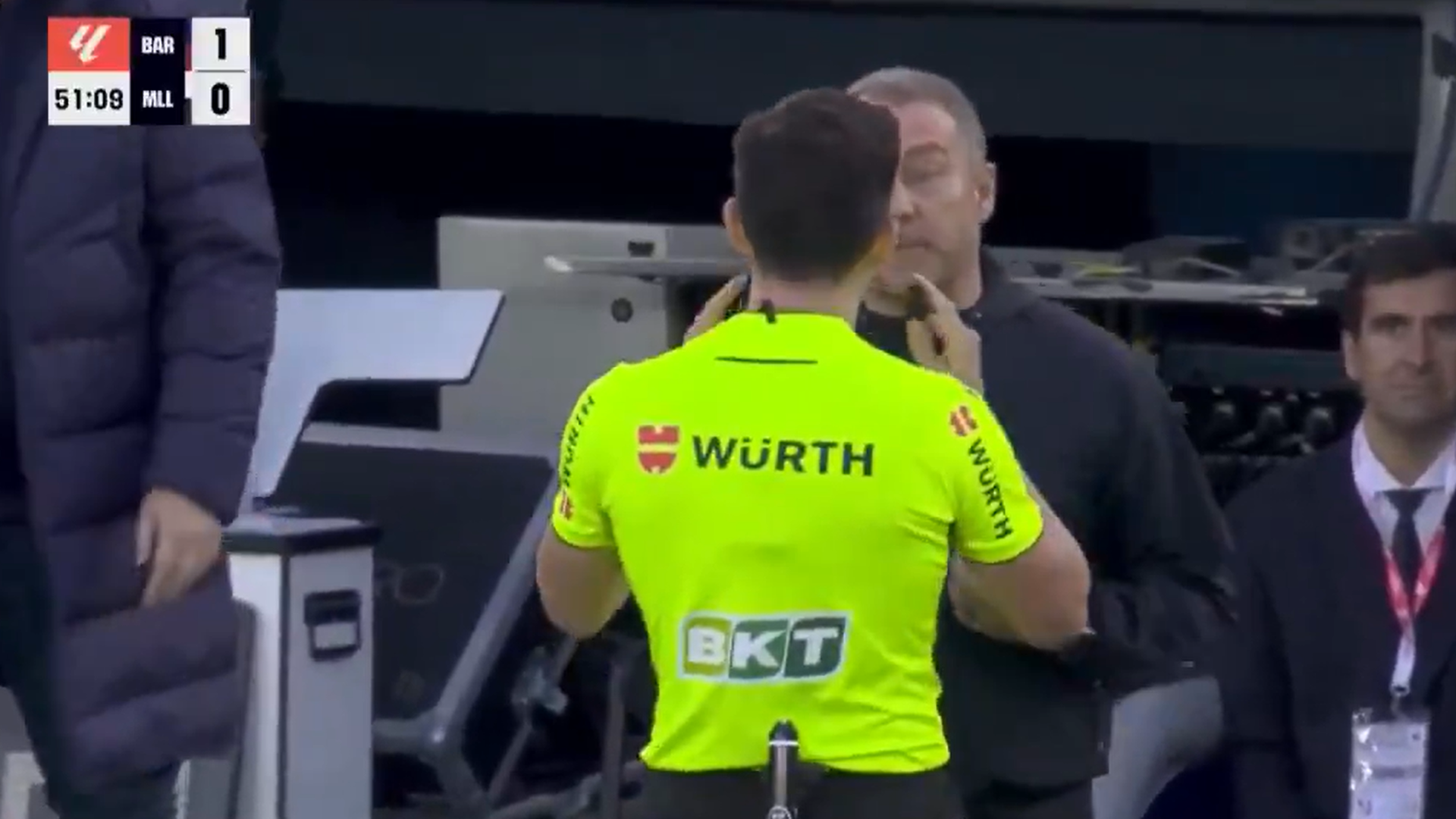 Fue en el 50', cuando una falta de Pablo Torre sobre Casadó al borde del área la ejecutó Rasfhord estrellándola directamente en la barrera. Y es que precisamente la barrera del cuadro bermellón estaba adelantada y ello provocó el enfado de Hansi Flick con Quintero González. El técnico alemán recriminó al colegiado la situación, pero solo sirvió para que se acercara hasta él y llamarle la atención por sus protestas.