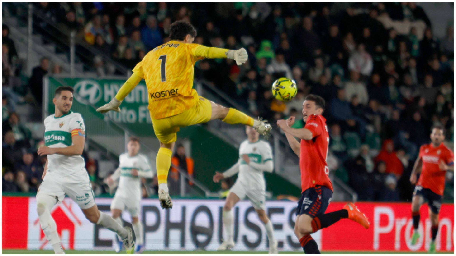 Mientras tanto, Osasuna jugaba a otra cosa. No necesitaba la pelota para sentirse vivo. Esperaba. Observaba. Medía los tiempos como un ajedrecista que sabe que la partida no se gana en el primer movimiento. Y cuando encontraba un hueco el Elche, allí estaba Sergio Herrera, celebrando cada parada como si hubiese marcado él mismo un gol en la escuadra. Sus guantes parecían tener imán esa noche.