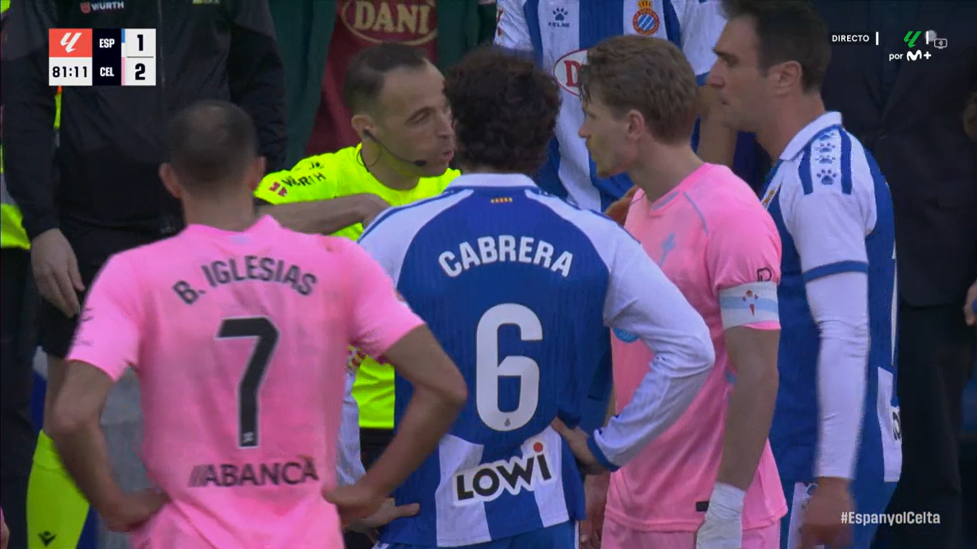 El RCD Espanyol y el Celta de Vigo terminaron igualando 2-2 en un partido en el RCDE Stadium que tuvo de todo, incluyendo la polémica. Los jugadores pericos se pusieron por delante en la segunda mitad con un gol de Borja Iglesias que terminaría siendo anulado por Cuadra Fernández en una jugada muy discutida por los celtistas y en la que incluso el colegiado del encuentro tuvo que explicársela a los capitanes.