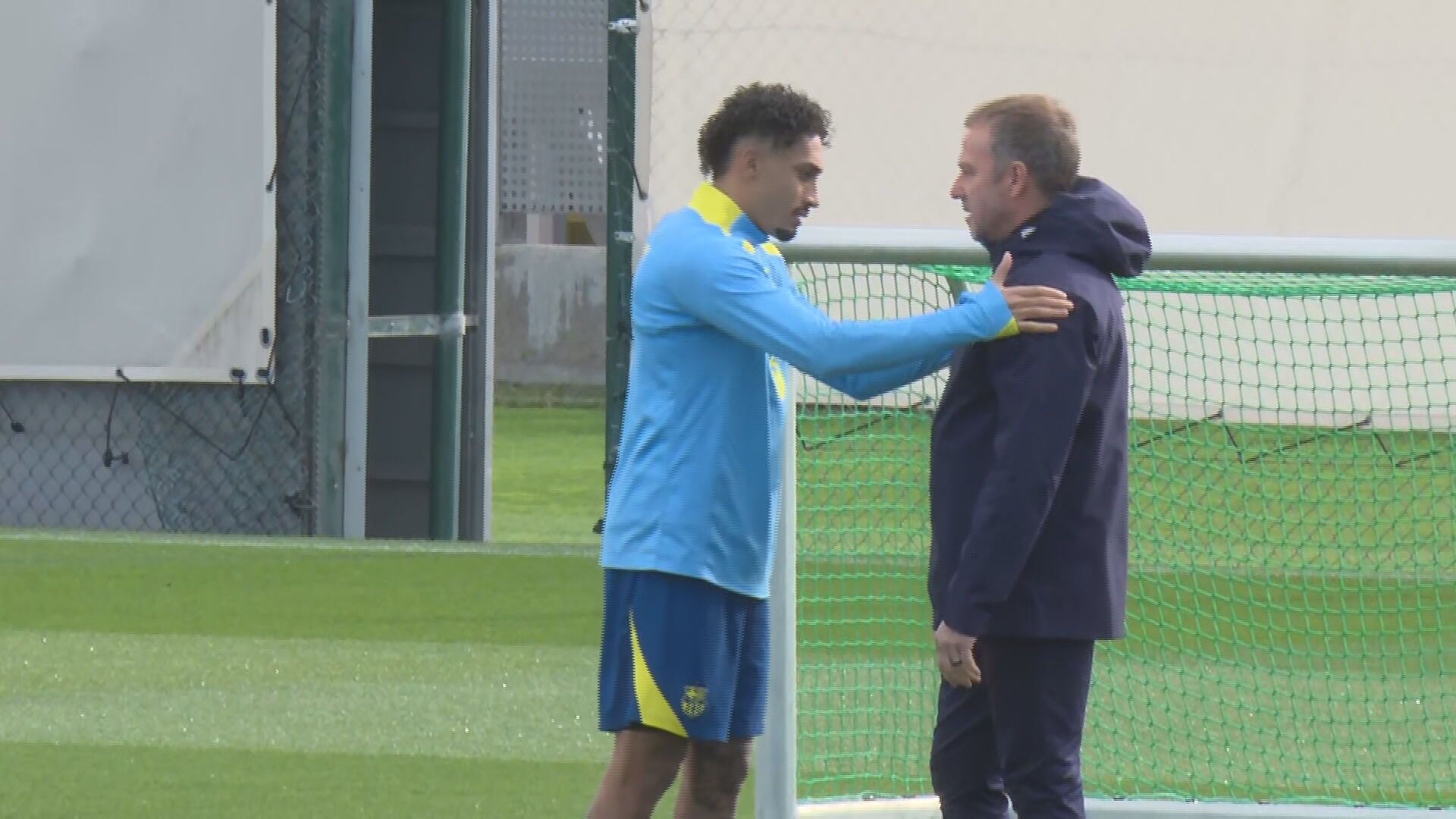 Raphinha y Hansi Flick, protagonistas del entrenamiento de este domingo