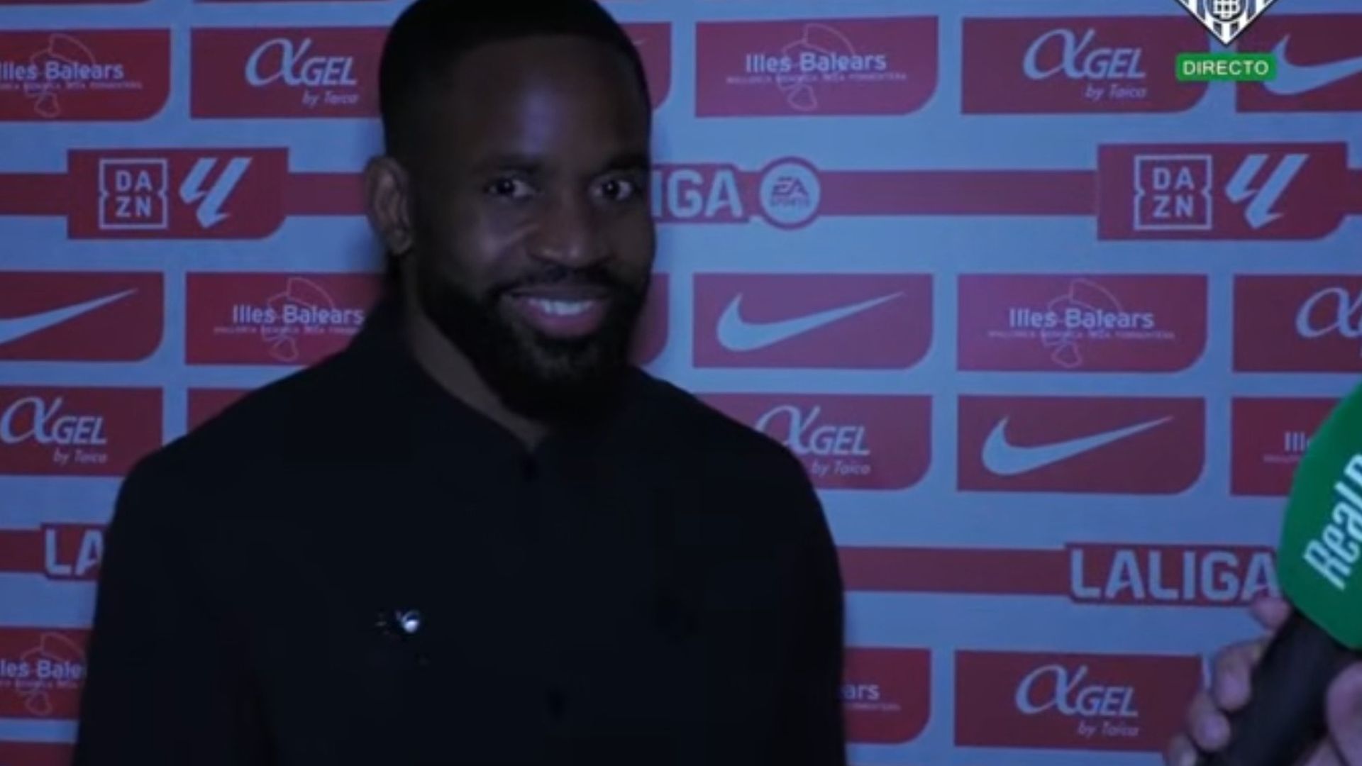 Los técnicos verdiblancos, rápidamente, buscaron solución y encendieron el foco de la propia cámara, dejando un plano diferente pero aún con el delantero presente. El periodista intentaba, entre bromas, continuar con total normalidad, pero Bakambu no lo podía evitar.