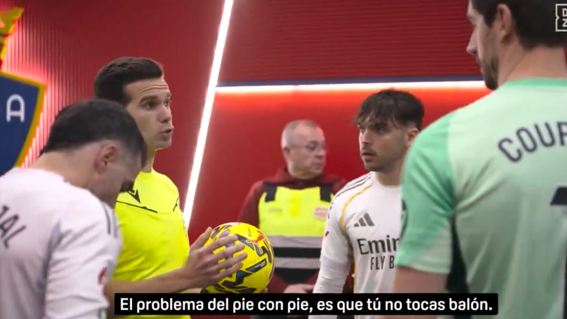 Courtois, por su parte, intenta defenderse: "Yo estaba saliendo, yo no hago un gesto para dar", explica. El árbitro responde al portero: "Eso lo hemos valorado, porque has llegado, has pisado y es un balón tardío".