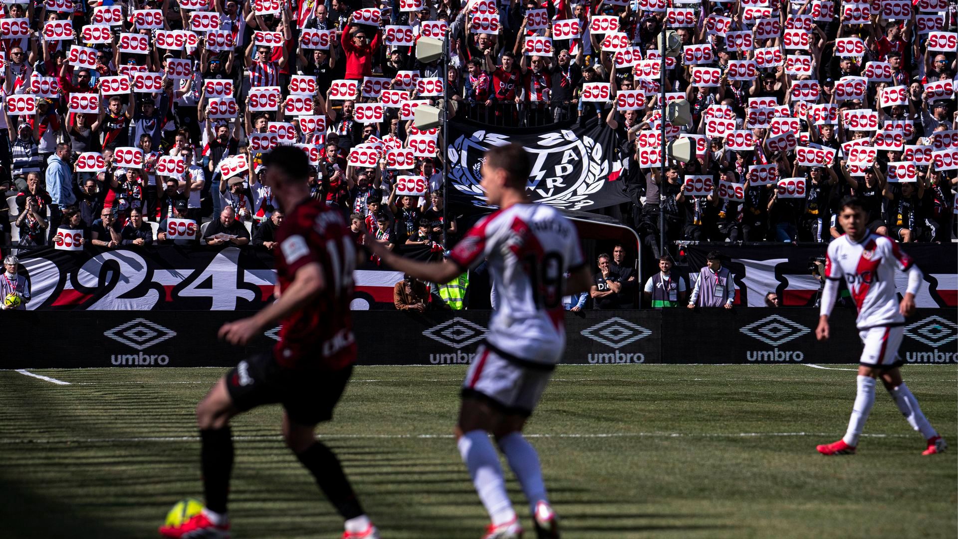 Con carteles de 'SOS', los 14.000 hinchas presentes en Vallecas protestaron contra la gestión de Martín Presa. No fueron sólo los rayistas, a ellos se les unió los miles de aficionados del Athletic con los que mantienen una gran relación.
