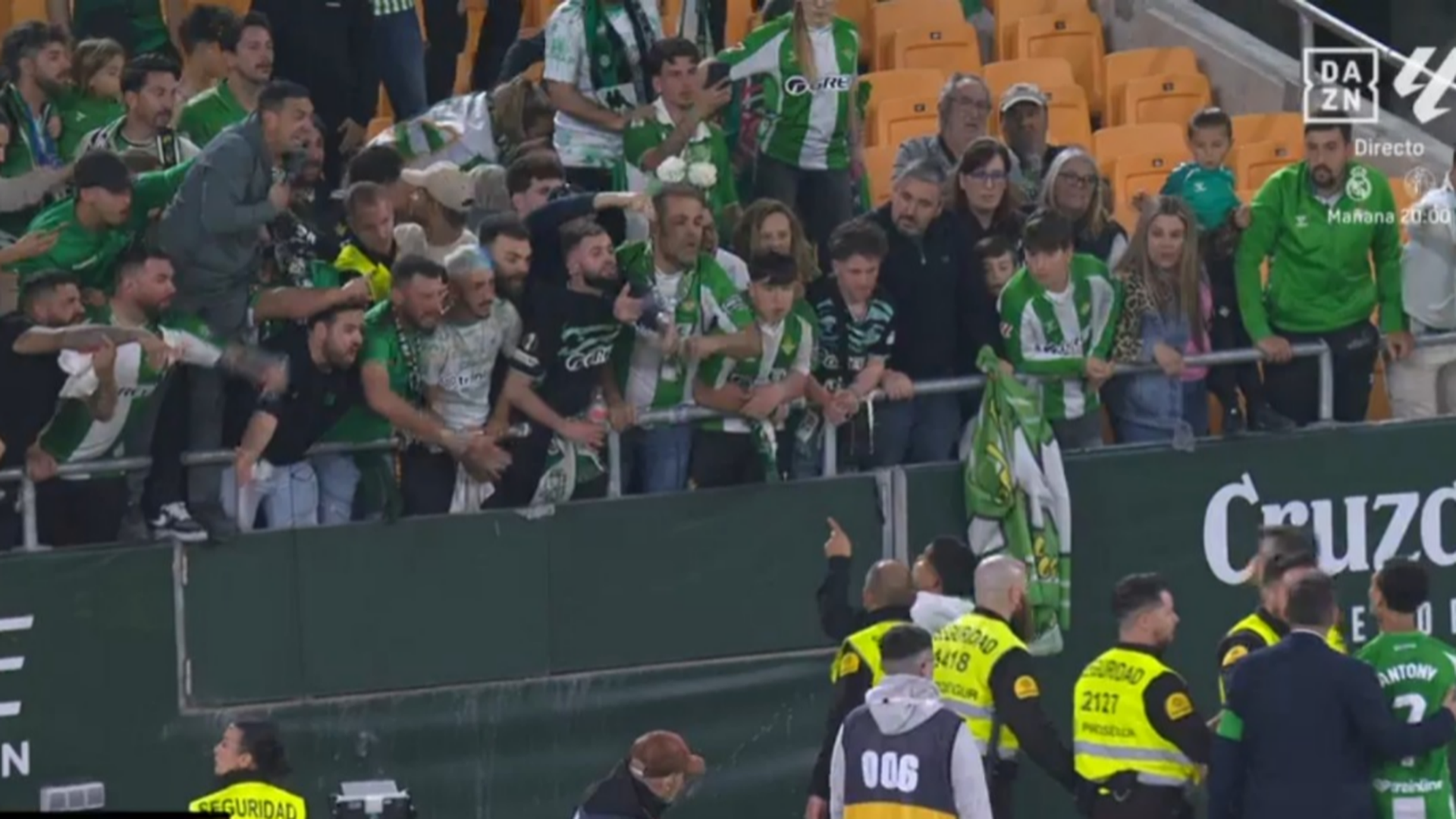 Fue poco después de finalizar el encuentro cuando Antony, a pesar de que varios compañeros intentaban pararle, se saltó una valla para acercarse a la grada. Desde allí, el brasileño miraba fijamente a los presentes y asentía, de manera desafiante, mientras escuchaba los reclamos