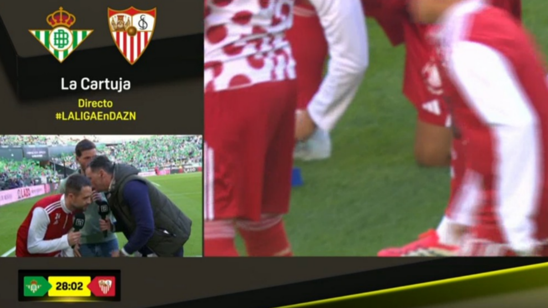 El Betis saltó al campo y La Cartuja explotó. Adnan Januzaj, jugador del Sevilla, protagonizó un curioso momento en la previa del derbi de este domingo cuando, en mitad de su entrevista, tuvo que acercarse a Capi para poder escuchar la pregunta debido al ruido.