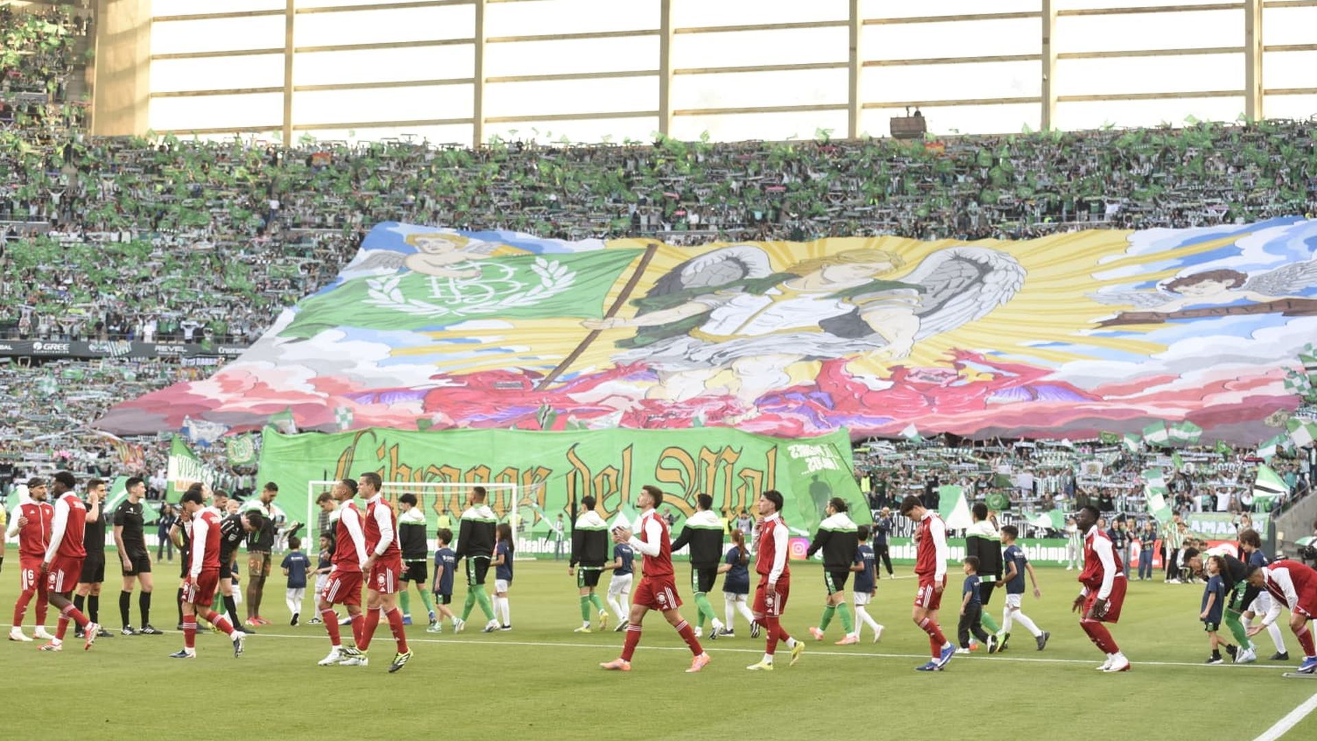 Espectacular tifo el que sacaron los ultras del Real Betis en la antesala del derbi contra el Sevilla FC. La grada de animación del club, Gol Sur 1907, desplegó un sensacional dibujo de un arcángel sobre el diablo, acompañada de querubines con la bandera y la fecha de fundación del club. Un retrato que tuvo un significado religioso detrás, con alusiones a la Biblia, y cuyo foco iba dirigido a los Biris Norte, en referencia al que sacaron en el duelo de la primera vuelta.