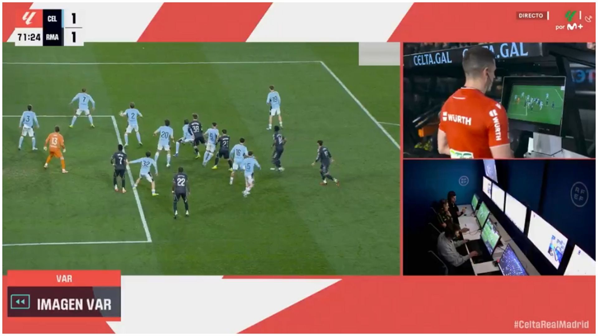 El VAR avisó inmediatamente al colegiado porque la acción parecía susceptible de sancionarse con penalti. De hecho, en las primeras repeticiones se apreciaba un contacto claro con el brazo del jugador del Celta, lo que generó las protestas del equipo madrileño.