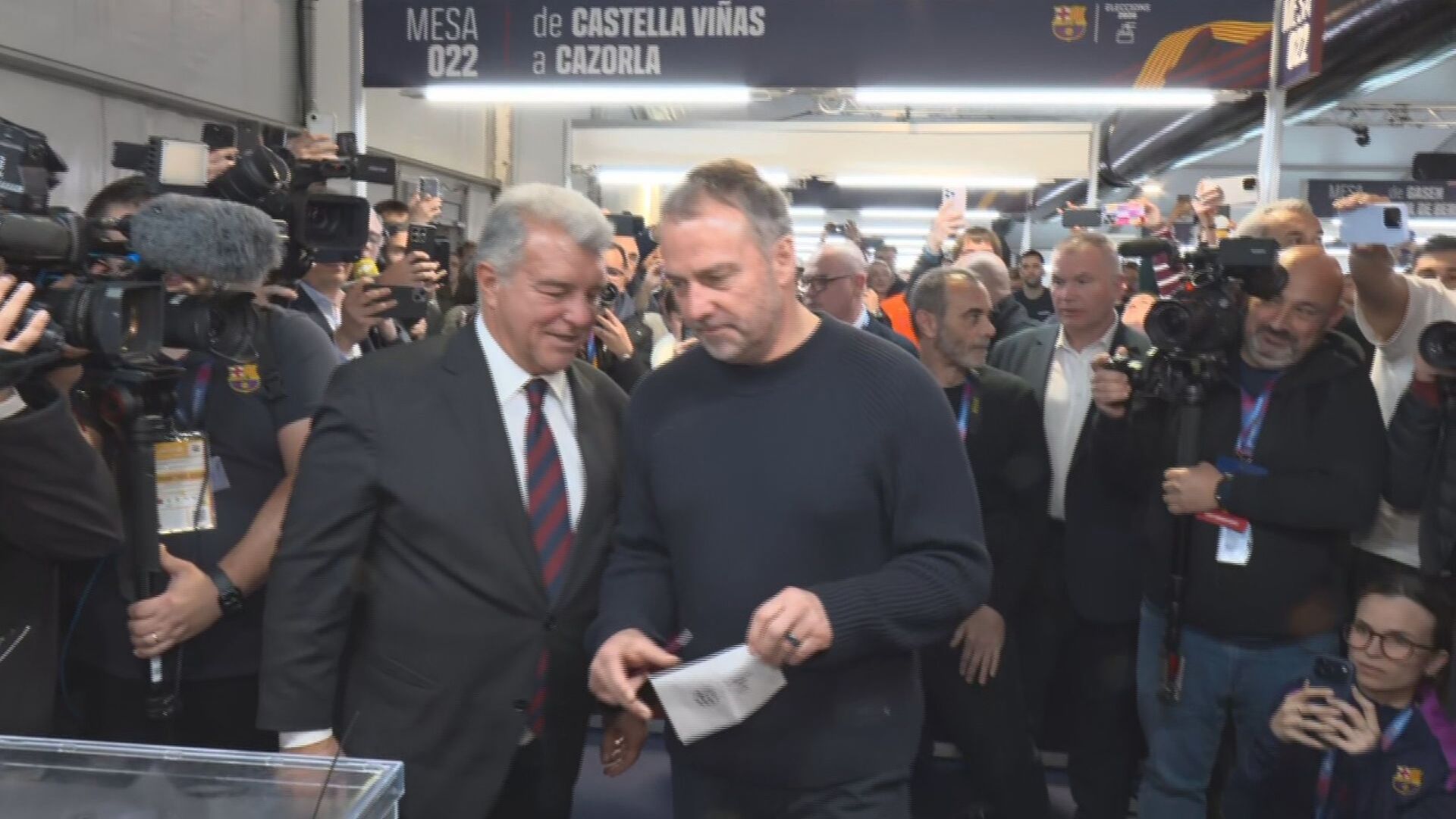 El entrenador Hansi Flick acudió a ejercer su derecho a voto como socio del club y fue recibido por Joan Laporta, que lo acompañó hasta la urna. El técnico alemán bromeó con los periodistas asegurando que su voto era “secreto”, aunque el momento más llamativo llegó segundos después.