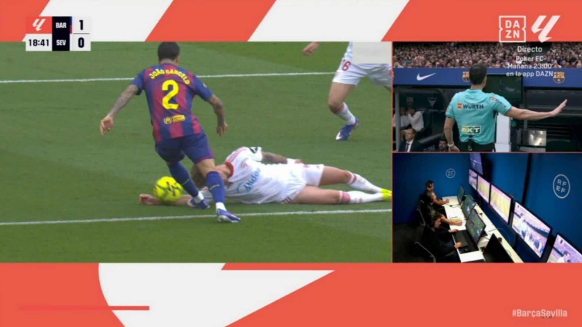 La primera de ellas ocurrió nada más comenzar, en el minuto siete. Cancelo recibe en el interior del área, Djibril Sow se cruza por detrás del azulgrana y termina trastabillándole con la rodilla. El sevillista buscó el balón de manera limpia, pero el rival llegó antes y termina siendo derribado en ese cruce. Uno de esos penaltitos que se pitan en LALIGA día sí y día no, y que esta vez cayó en contra del Sevilla FC.