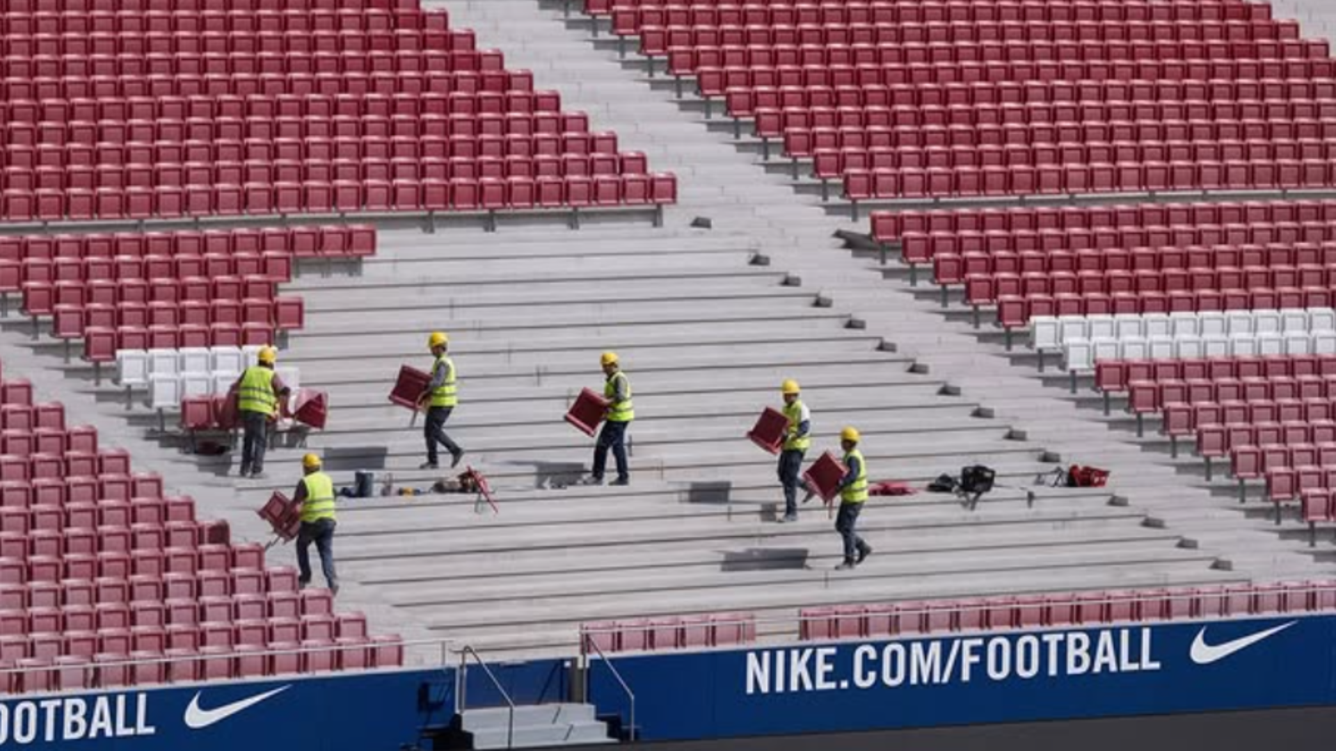 "Algo está pasando en el Riyadh Air Metropolitano", ha escrito el club colchonero. En la imagen, creada con Inteligencia Artificial, aparecen seis operarios retirando cientos de butacas correspondientes al sector 120, ubicado en la grada baja de Lateral Este, cerca del córner con el Fondo Norte.