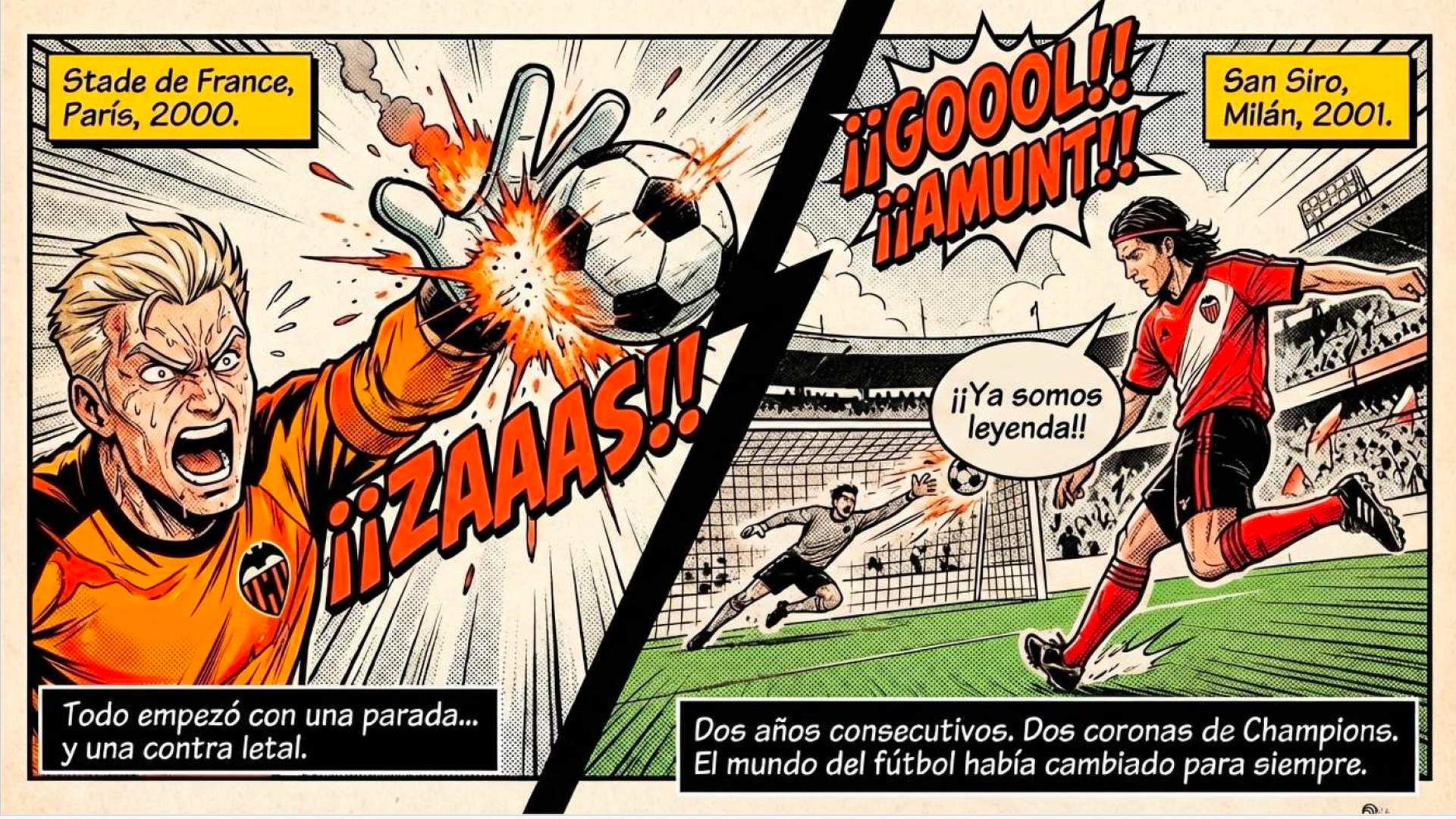 El cómic es, según relata su propio autor a ElDesmarque proyecto visual recrea una historia alternativa en la que el Valencia CF cambia el rumbo del fútbol europeo tras las finales de Champions League de 2000 y 2001. La pieza, desarrollada por Miguel Albors en formato cómic y con una estética inspirada en el manga deportivo, plantea cómo aquellos momentos clave podrían haber dado paso a una etapa de dominio tanto en España como en Europa.