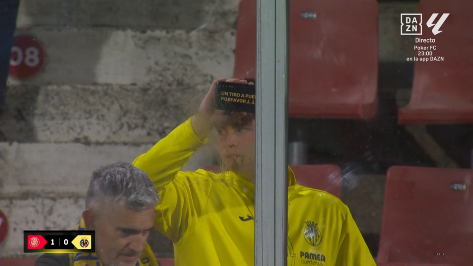Apenas había una veintena de hinchas del Villarreal, pero uno de ellos, vestido de amarillo, no dudó a la hora de mandar un mensaje a sus jugadores: "Un tiro a puerta, por favor". Lo escribió en el teléfono móvil, con sus iconos incluidos, y lo captaron las cámaras de Dazn en pleno directo, apenas unos segundos después de que el árbitro decretara el final.