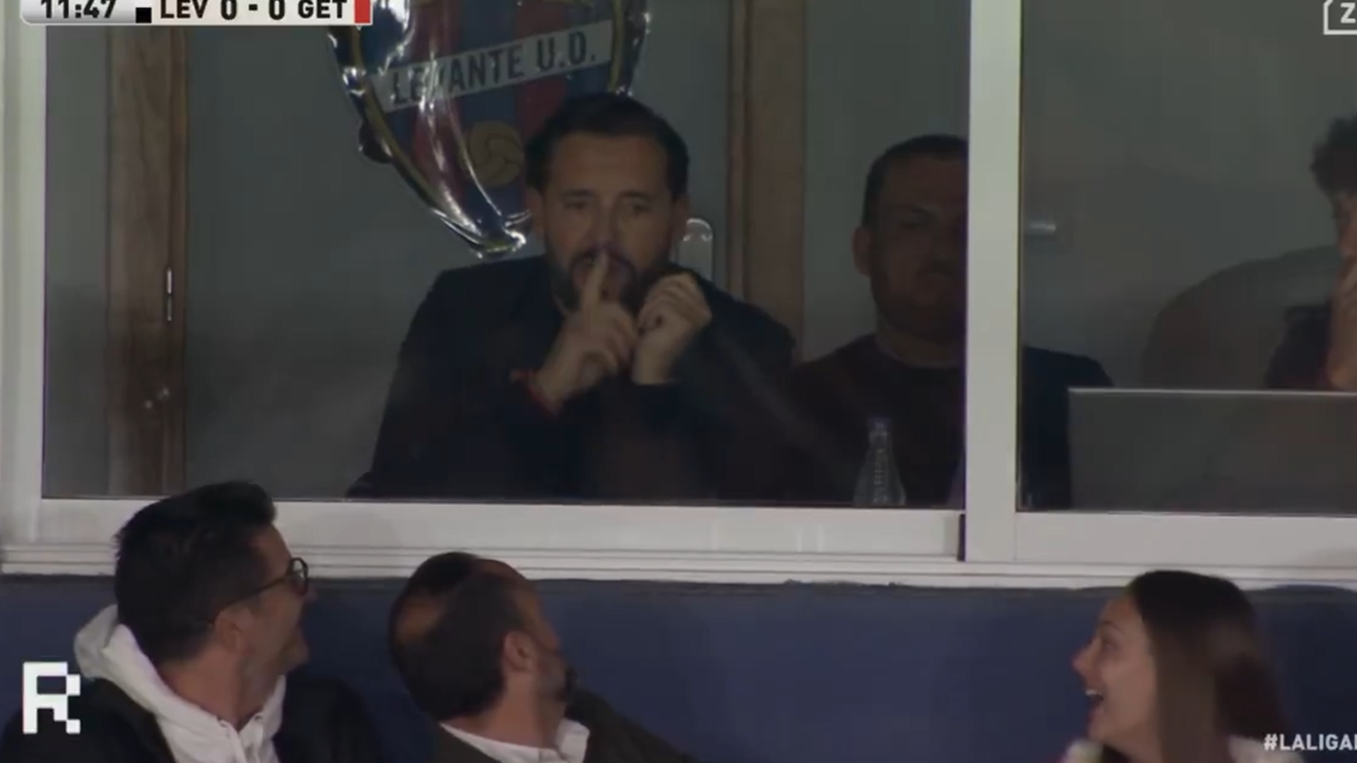 En ese momento, Bordalás tuvo sus más y sus menos con la afición. Tal y como captaron las cámaras de Dazn, primero pegó varios porrazos a la mampara del palco en el que estaba ubicado. En ese momento, los hinchas que estaban más cerca se dieron la vuelta, entre risas, sorprendidos por lo que estaban presenciando. Luego, Bordalás mandó se puso el dedo en la boca, mandándoles a callar.