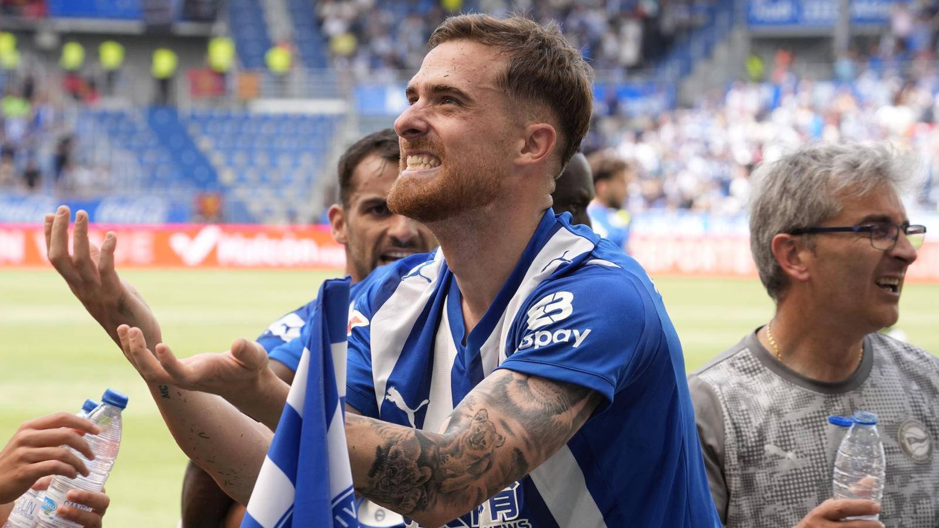 El delantero del Alavés llegó casi entre lágrimas por la emoción y el sufrimiento de un triunfo que saca al Alavés del pozo y tranquilizando por su estado físico: "Sí, tranquilos. Estoy exhausto, muerto después de tantos partidos pero merece la pena cada esfuerzo porque ha sido un año duro y estoy viendo la recompensa y no tiene precio".