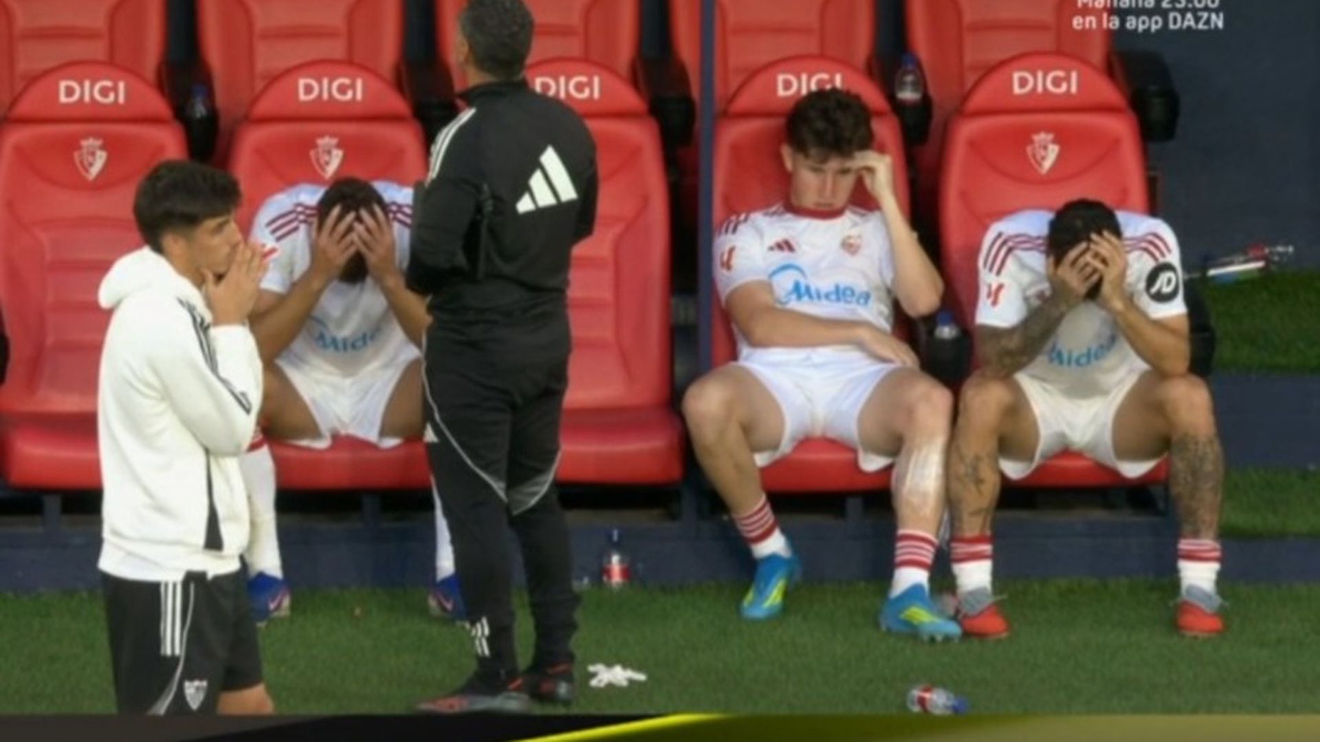 Los jugadores del Sevilla terminaron rotos sobre el campo y en el banquillo tapándose la cara sin poder creerse lo que había sucedido en el encuentro ante Osasuna. Tampoco los fans desplazados a la capital de Navarra, con lágrimas en los ojos ante una derrota que deja a los suyos a un punto de la salvación.